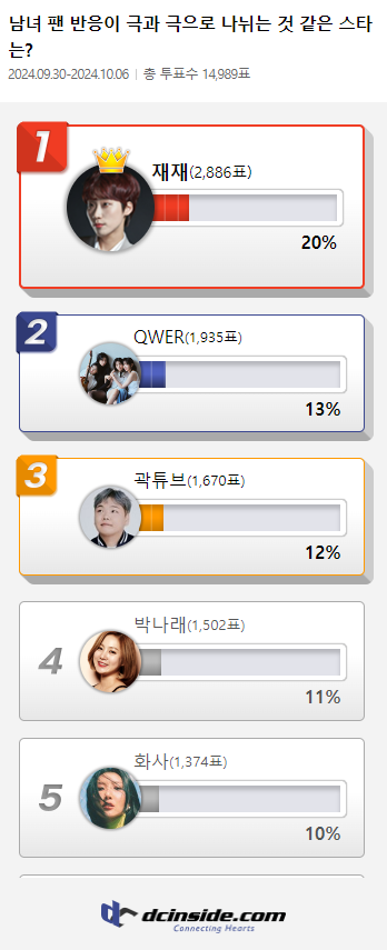 커뮤니티 포털사이트 디시인사이드(대표 김유식)가 `남녀 팬 반응이 극과 극으로 나뉘는 것 같은 스타는?`으로 투표를 한 결과 재재가 1위에 올랐다.