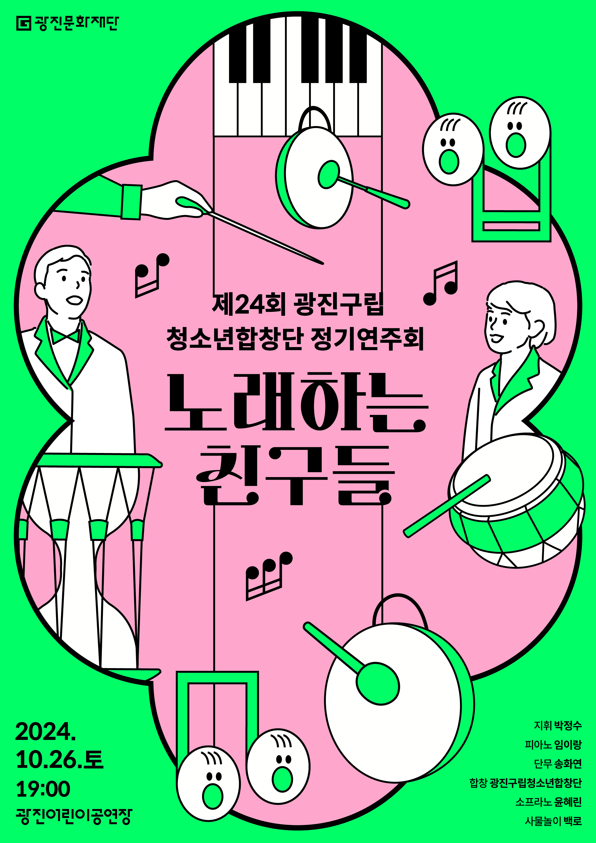 ‣ 공 연 명 : 광진구립청소년합창단 제24회 정기연주회 '노래하는 친구들' ‣ 공연일시 : 2024. 10. 26.(토) 19:00 ‣ 공연장소 : 광진어린이공연장 ‣ 주최/주관 : (재)광진문화재단, 광진구립청소년합창단 ‣ 소요시간 : 약 90분 ‣ 입장연령 : 전체 관람가 ‣ 입 장 권 : 전석 무료 ‣ 예약문의 : 광진문화재단 02-2049-4763 |