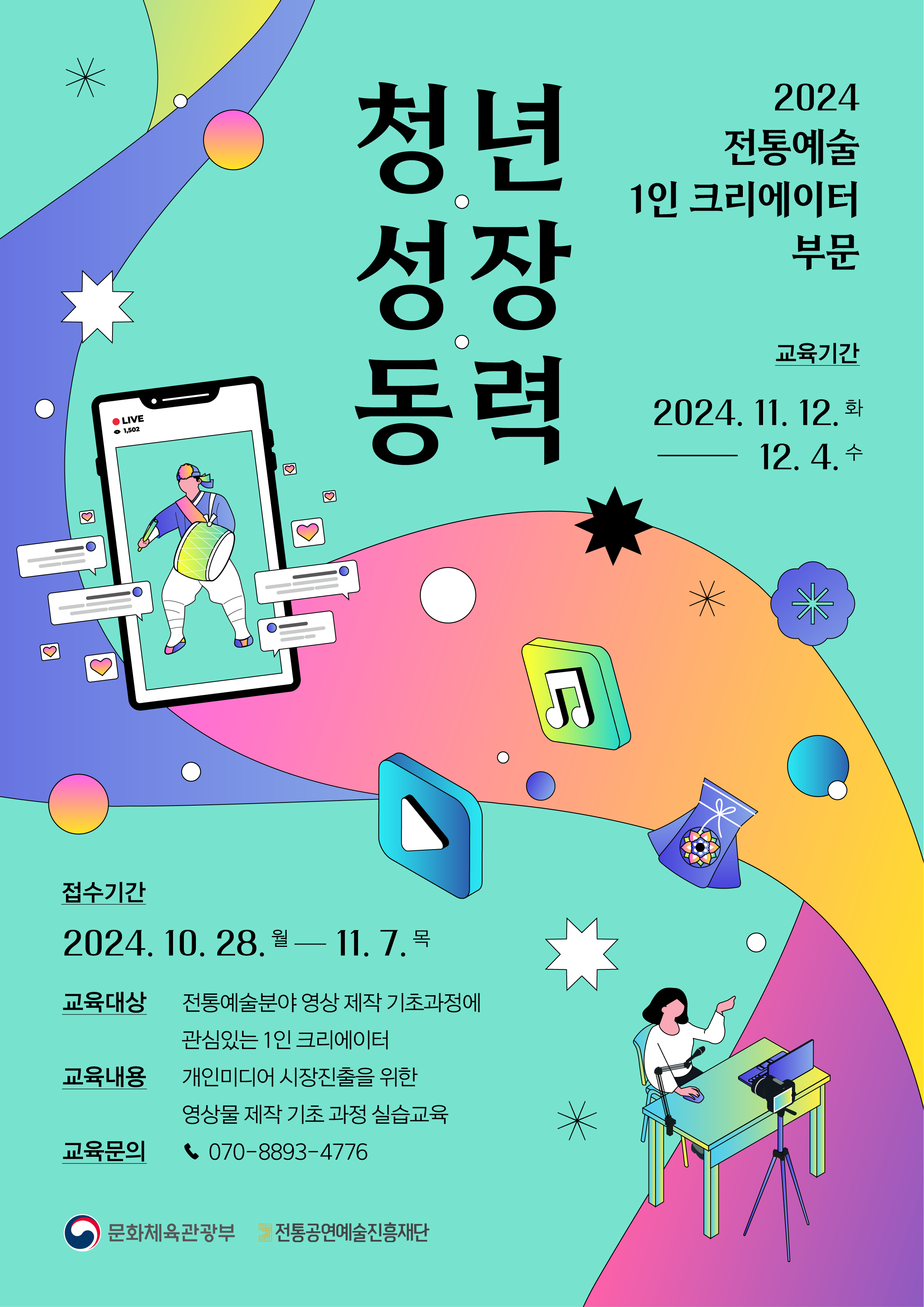 [플레이뉴스 문성식기자] 전통공연예술진흥재단(이사장 김삼진)은 청년예술가의 안정적인 예술시장 진입을 위한 ‘2024 청년예술가 역량강화 - 전통예술 1인 크리에이터 부문’ 교육 참여자를 10월 28일부터 11월 7일까지 모집한다.
