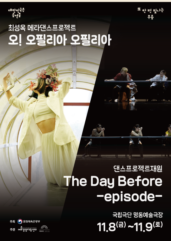 11월 8일(금)~9일(토) 이틀간 '또 한 번 빛나는 무용' 프로그램을 통해 현대무용의 다채로운 레퍼토리를 선보인다. 최성옥 메타댄스 프로젝트의 '오! 오필리아 오필리아'는 셰익스피어의 고전 '햄릿'에 등장하는 오필리아의 비극적인 삶과 사랑을 2인무로 재조명한다.