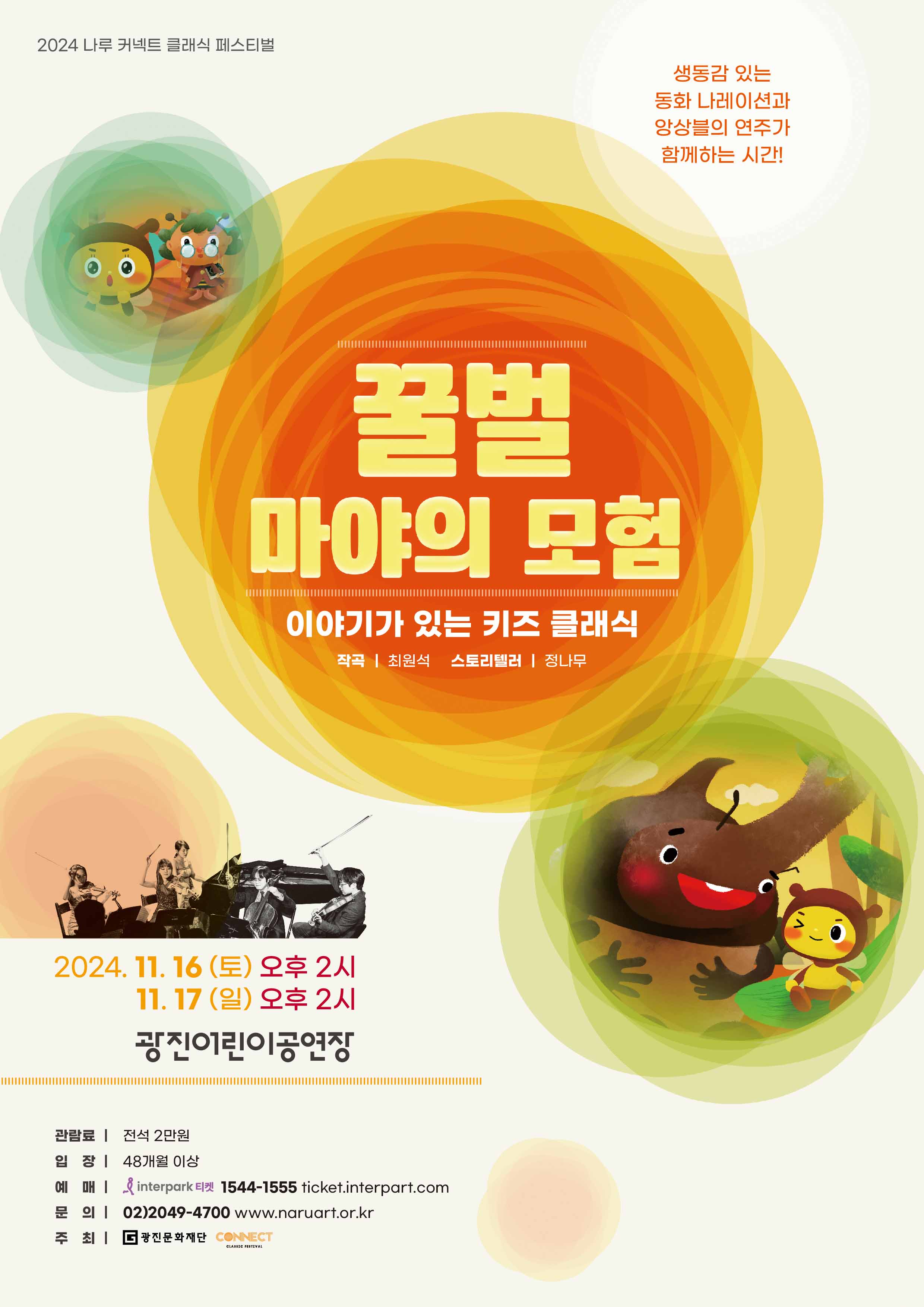 ‣ 공 연 명 : 이야기가 있는 키즈 클래식 '꿀벌 마야의 모험' ‣ 공연일시 : 2024. 11. 16.(토) ~ 17.(일) 14:00 ‣ 공연장소 : 광진어린이공연장 ‣ 주최/주관 : (재)광진문화재단, 커넥트 아츠 페스티벌 ‣ 소요시간 : 약 60분 ‣ 입장연령 : 48개월 이상 ‣ 입 장 권 : 전석 20,000원 ‣ 공연문의 : 광진문화재단 02-2049-4700 |