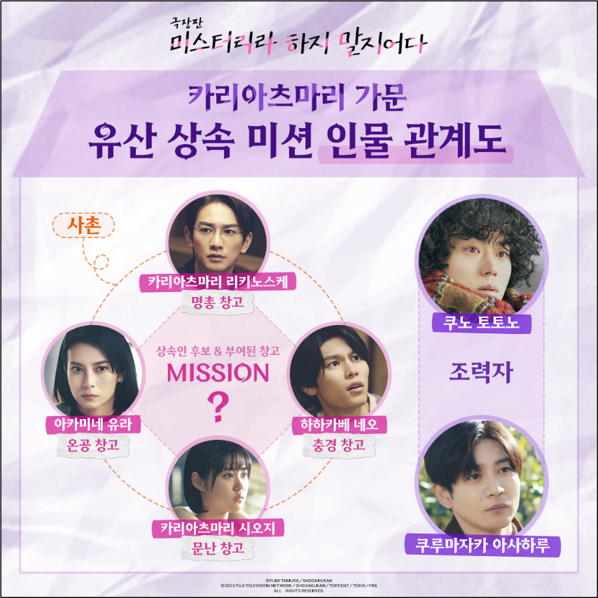 토토노 앞에 난데없이 나타나 사건을 부탁하면서 사사건건 티키타카 케미스트리를 빚는 의뢰인 시오지 역의 하라 나노카부터 마치다 케이타, 하기와라 리쿠, 시바사키 코우 등 일본을 대표하는 배우들이 카리아츠마리 가문의 예비 상속자들로 매력을 더하며 극을 풍성하게 만든다.