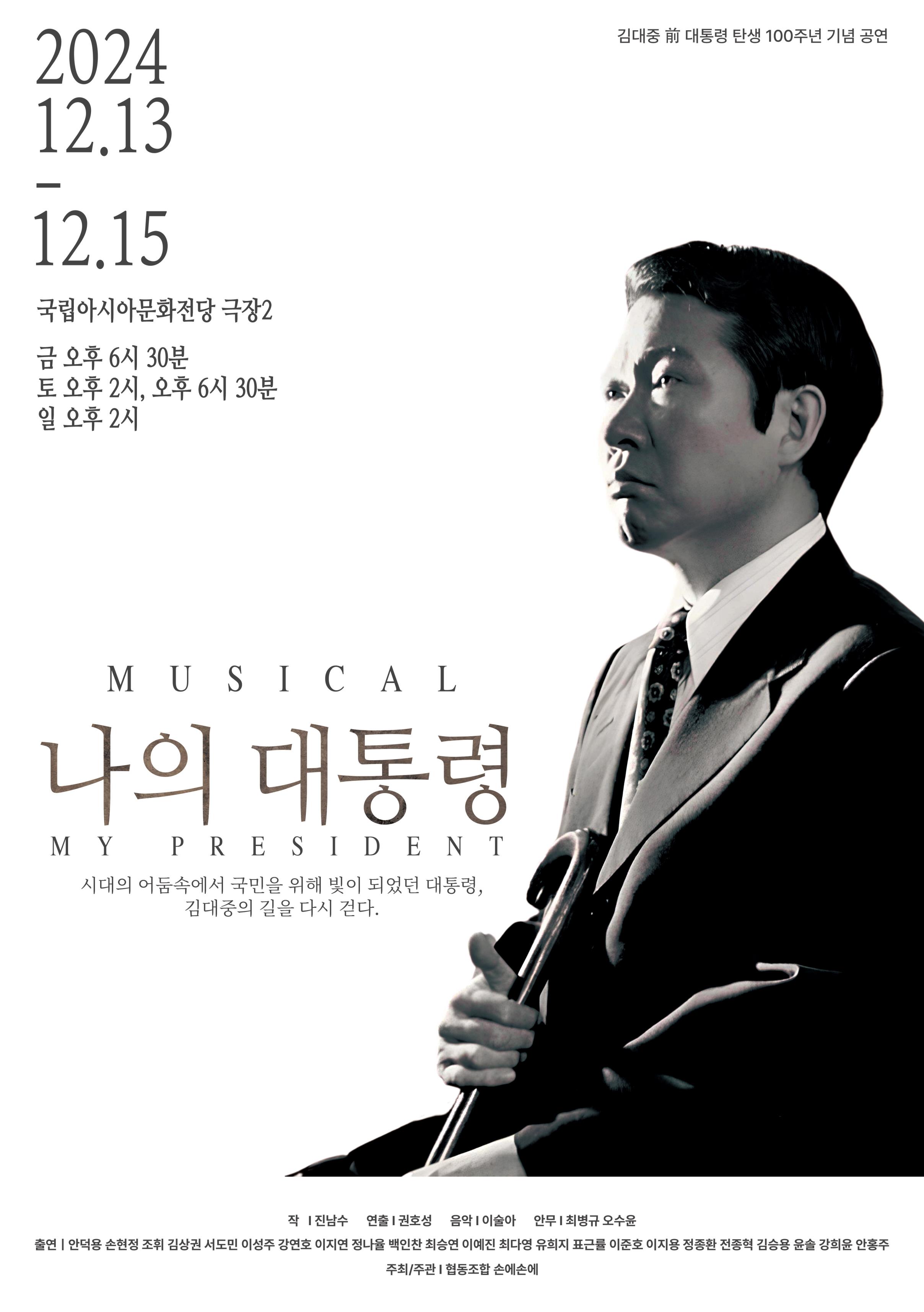 김대중 前 대통령 탄생 100주년을 맞아 기획된 뮤지컬 '나의 대통령'이 오는 12월 13일에서 15일, 3일간 국립아시아문화전당에서 프리뷰 공연으로 첫 선을 보이며, 내년에는 수도권 대극장에서 장기공연을 이어간다.