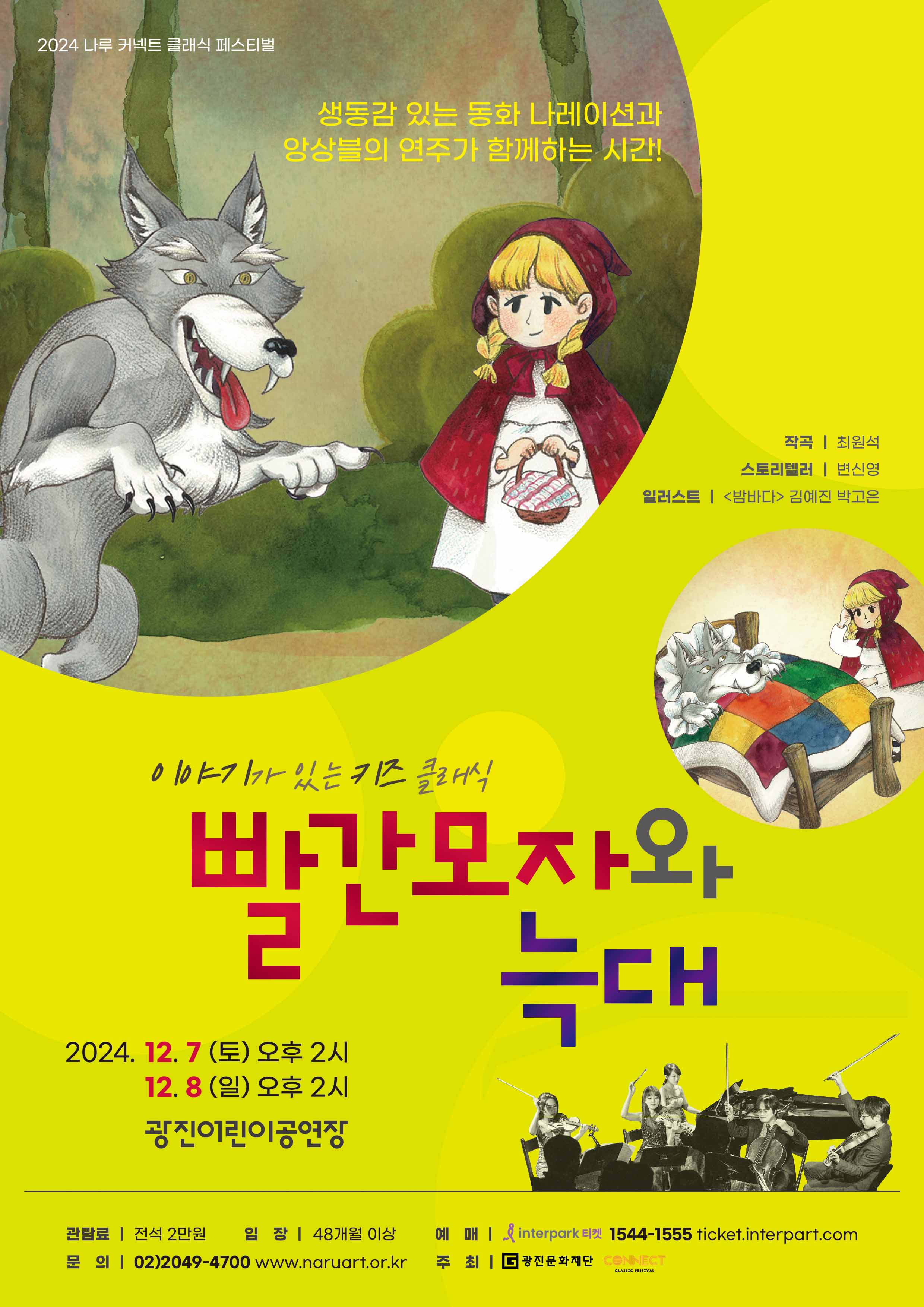 ‣ 공 연 명 : 이야기가 있는 키즈 클래식 <빨간모자와 늑대> ‣ 공연일시 : 2024. 12. 7.(토) ~ 8.(일) 14:00 ‣ 공연장소 : 광진어린이공연장 ‣ 주최/주관 : (재)광진문화재단, 커넥트 아츠 페스티벌 ‣ 소요시간 : 약 60분 ‣ 입장연령 : 48개월 이상 ‣ 입 장 권 : 전석 20,000원 ‣ 공연문의 : 광진문화재단 02-2049-4700 |