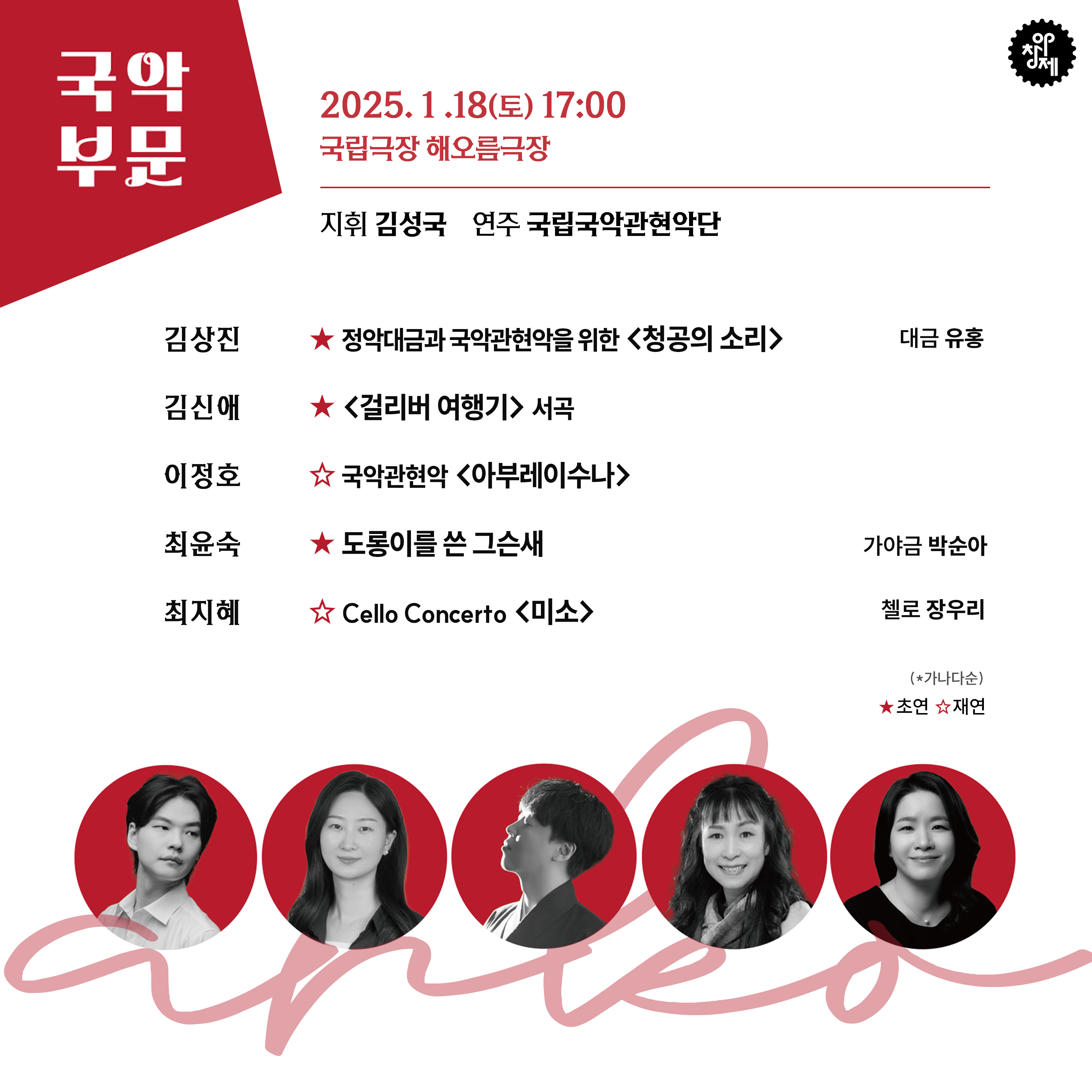 [플레이뉴스 문성식기자] 한국문화예술위원회(위원장 정병국, 이하 아르코)와 한국창작음악제추진위원회(위원장 이건용, 이하 아창제)가 주최하는 대한민국의 대표 창작음악제인 '제16회 ARKO한국창작음악제' 국악부문 연주회가 2025년 1월 18일(토) 오후 5시 국립극장 해오름극장에서 열린다.