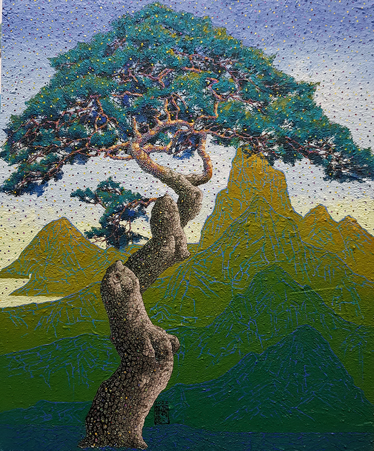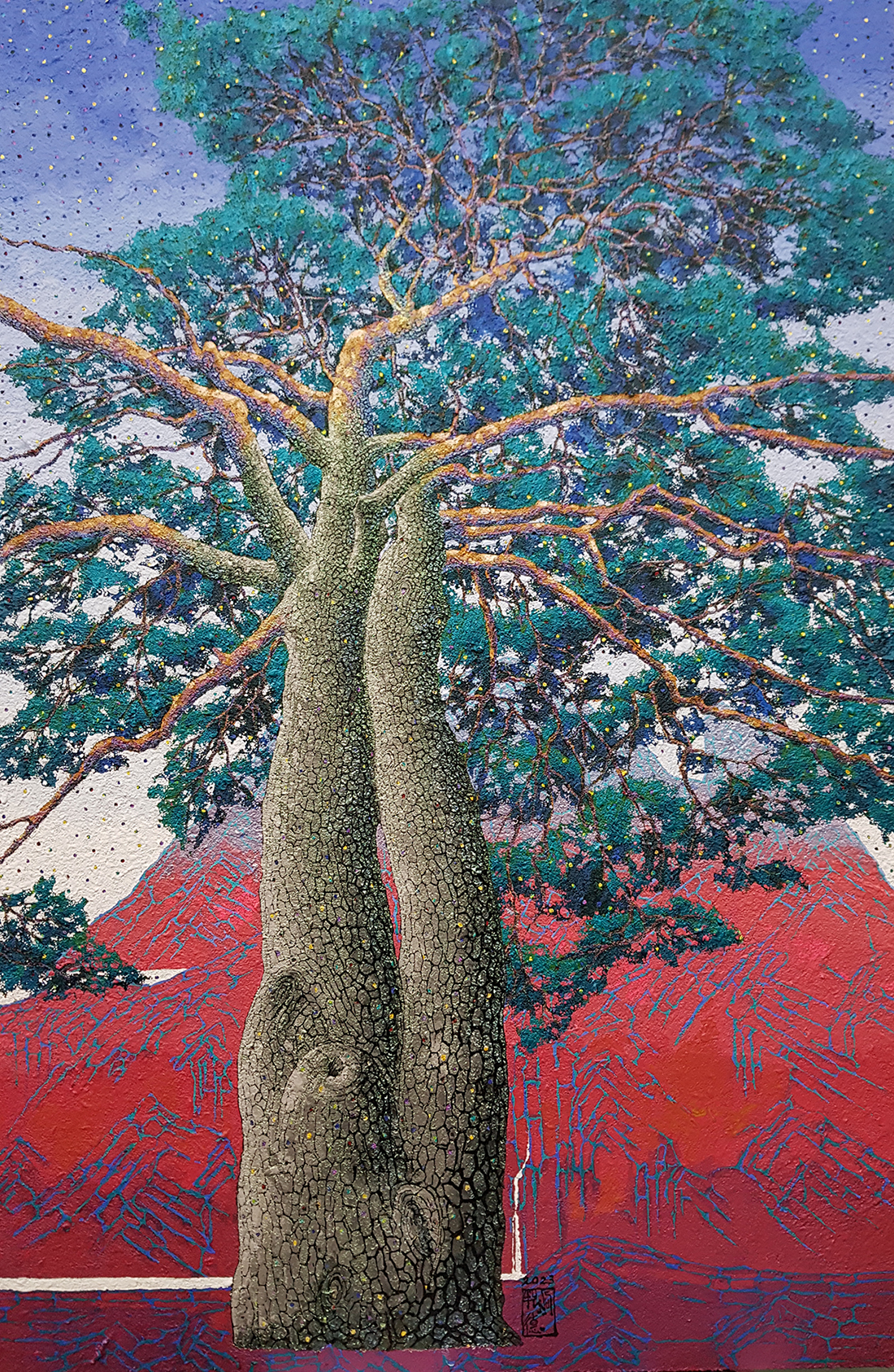 하판덕 선생님의 작업 세계는 불변하는 가치를 탐구하는 이미지를 담고 있으며 작품은 소나무와 뒷배경의 강렬한 색감과 조형미를 통해, 우리에게 인간 존재의 본질을 묻는다.