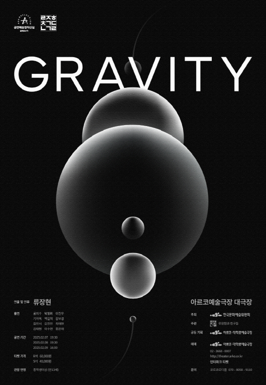 | 무용 | GRAVITY | 현대무용 안무가 류장현의 신작. 인간의 물리적, 정서적, 그리고 철학적 중력에 대한 탐구를 기반으로 한 무용 작품. 중력의 물리학적 특성을 다루며, 춤과 움직임을 통해 시각적으로 표현한 작품. |