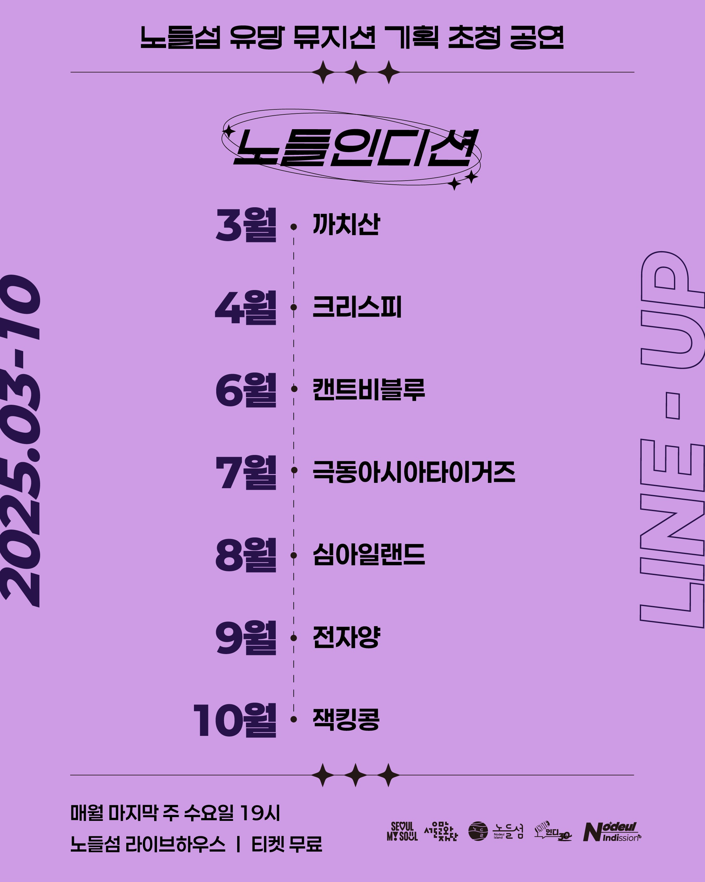 '노들인디션'은 대규모(450석 이상) 단독공연 경험이 없는 인디밴드와 싱어송라이터를 대상으로 노들섬 라이브하우스에서의 공연을 지원하는 2025년 신규 사업이다.