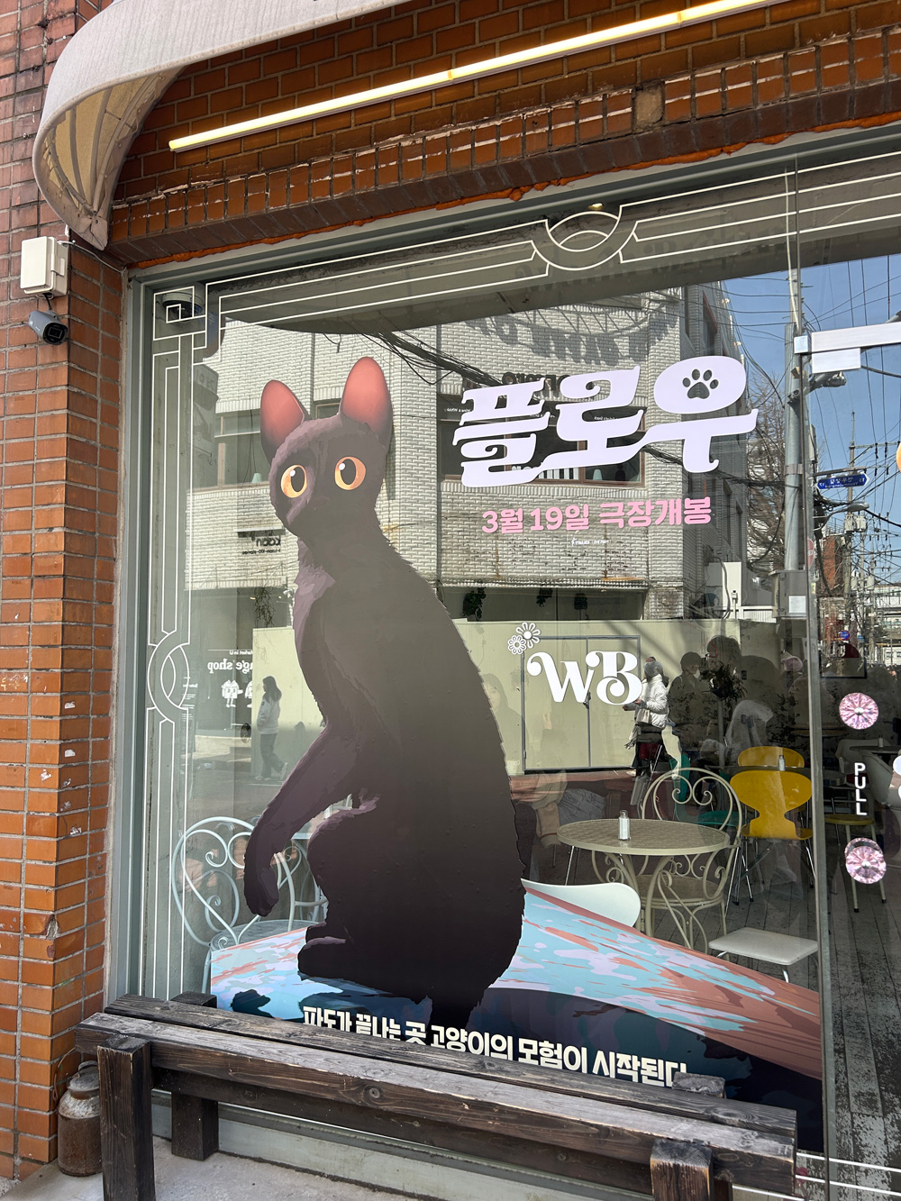 카페 웜브라운은 전면 유리창에 '플로우' 속 고양이와 골든 리트리버, 카피바라, 여우원숭이, 뱀잡이수리가 자리를 잡아 눈을 즐겁게 만들며 카페 내부에서도 포스터, 스티커, 미니 배너 등 다양한 영화 관련 아이템을 발견할 수 있다.
