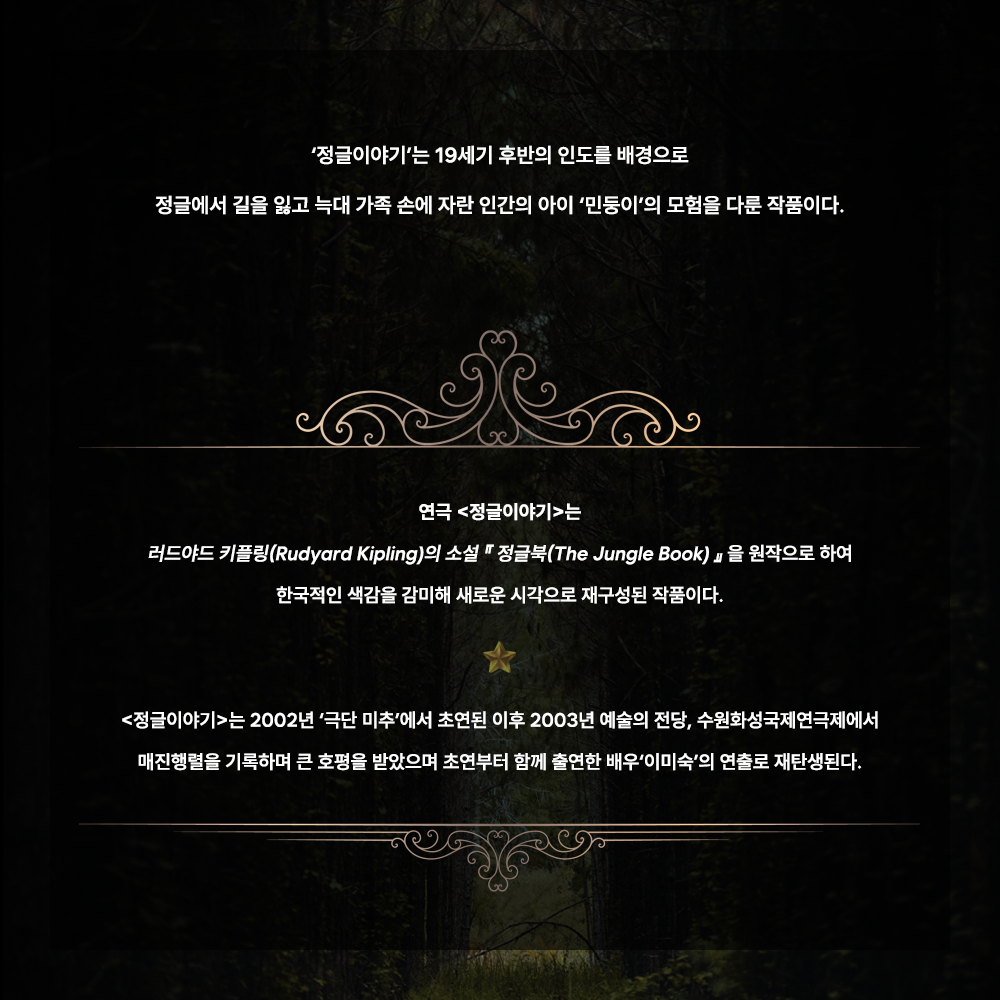 연극 '정글이야기'는 러디어드 키플링의 ‘정글북’을 원작으로 하여 한국적 색감을 감미해 새롭게 재구성된 작품으로, 2002년 ‘극단 미추’에서 초연된 이후 2003년 예술의 전당, 수원화성국제연극제에서 매진행렬을 기록하며 큰 호평을 받기도했다.