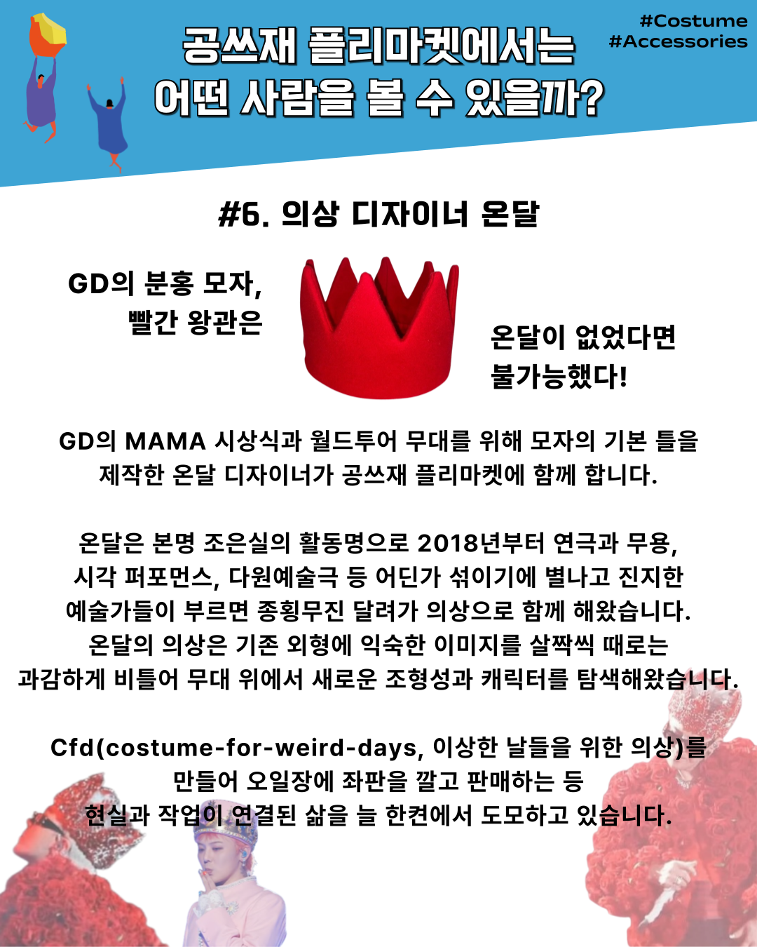 또 서울시와 서울문화재단이 운영하는 공연물품 공유 플랫폼 [리스테이지 서울]이 협력 기관이자 나누미로서 소장 중인 의상과 소품으로 참여하며, 서울세계무용축제, 춘천공연예술제, 서울국제공연예술제 등 공연예술 축제 기념품 및 프로그램북도 만날 수 있다.