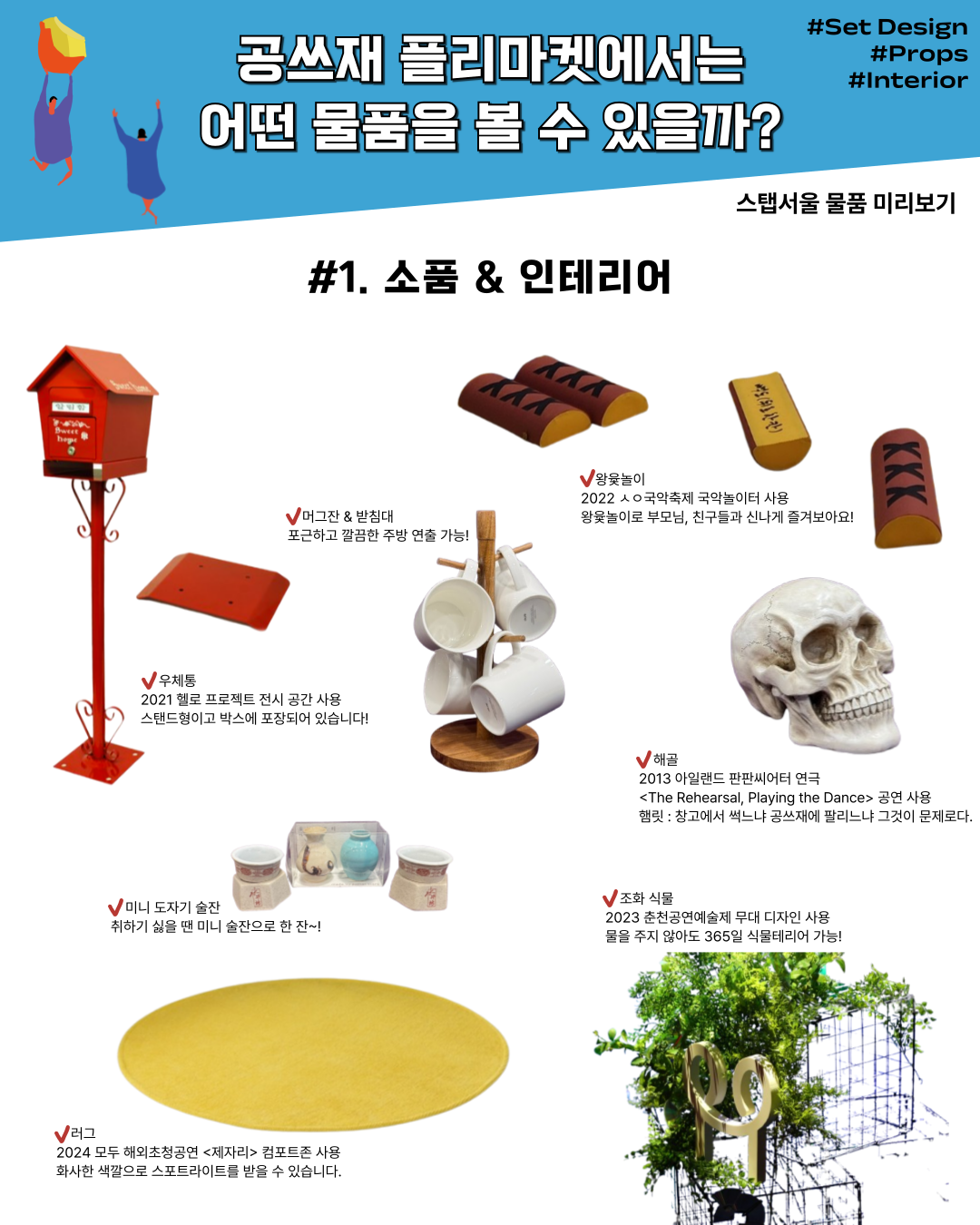 그 밖에도 공연예술인의 소장품이거나 공연에 사용된 물건들이 매대에 오른다. 의상 디자이너 온달의 자체 제작 브랜드 [이상한 날들을 위한 의상(Cfd, costume-for-weird-days)], 포스터 디자이너 김솔(보통현상)이 현장에서 직접 그려주는 초상화, 배우 백혜경(빙빙타로)의 타로 상담, 뮤지컬 및 연극 대본집과 굿즈, 중고 의류와 도서, 조화 꽃 부자재, 빈티지‧앤틱 소품, 핸드메이드 악세사리, 공병을 재활용한 인테리어 소품 등이다.