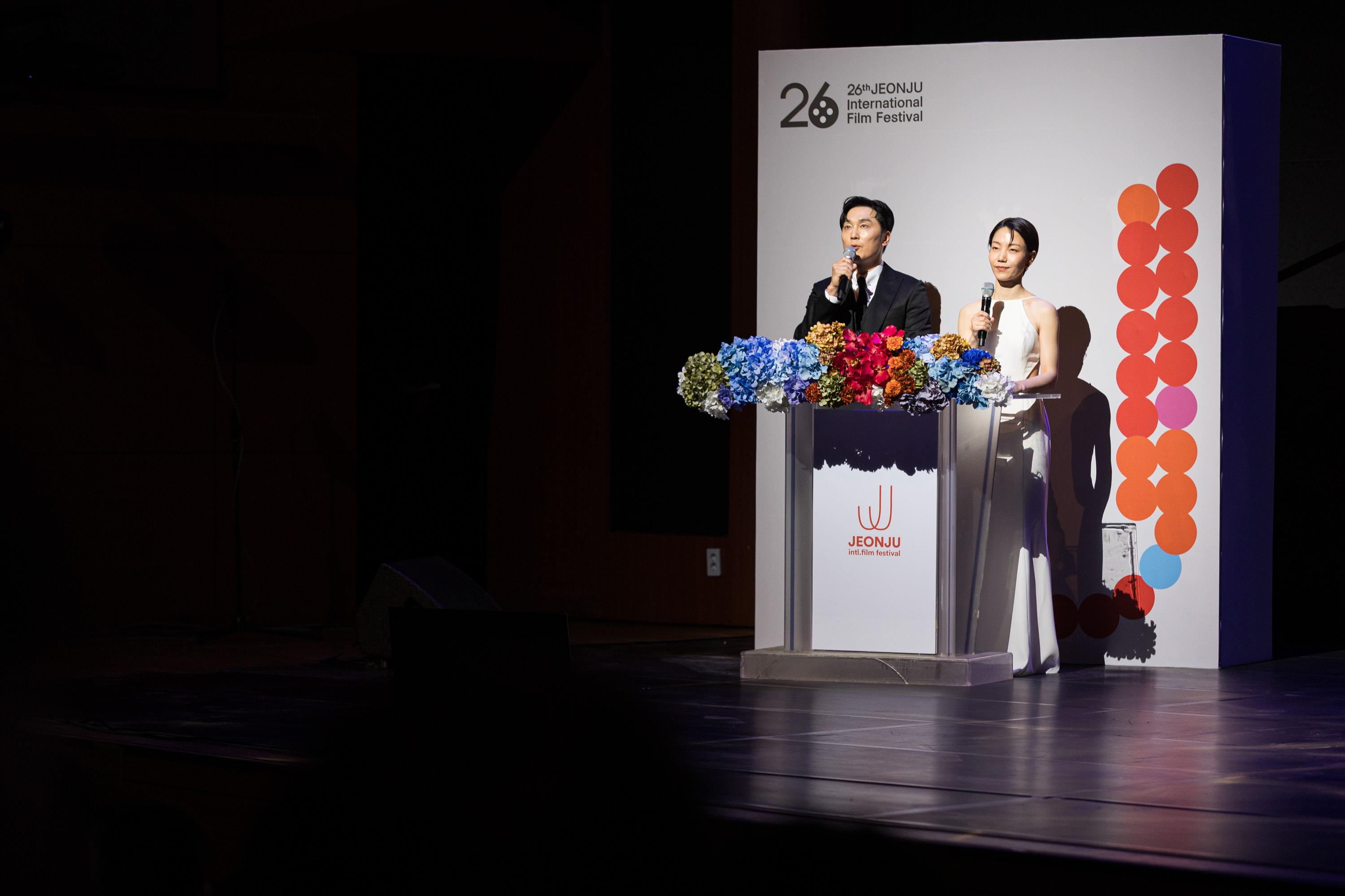 개막식 사회자 김신록‧서현우 배우의 재치있는 사회를 시작으로 전주국제영화제는 개막식을 찾은 관객들에게 화려한 행사와 다채로운 소식을 전했다. 민성욱‧정준호 공동집행위원장은 각각 “영화는 시대의 거울이자, 사람과 사람을 잇는 가장 아름다운 언어이다.