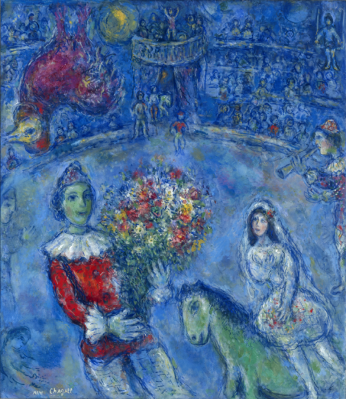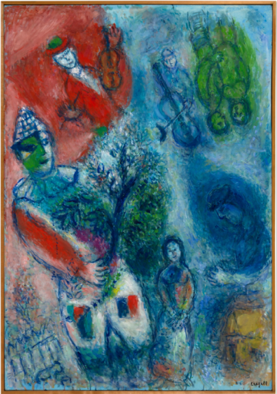 | Marc Chagall, Le clown au buisson, 1975, Oil on canvas. © Chagall ®, by SIAE 2025. | Marc Chagall, Souvenir de la Flûte enchantée, 1976, Tempera, oil and sawdust on canvas. © Chagall ®, by SIAE 2025. | |