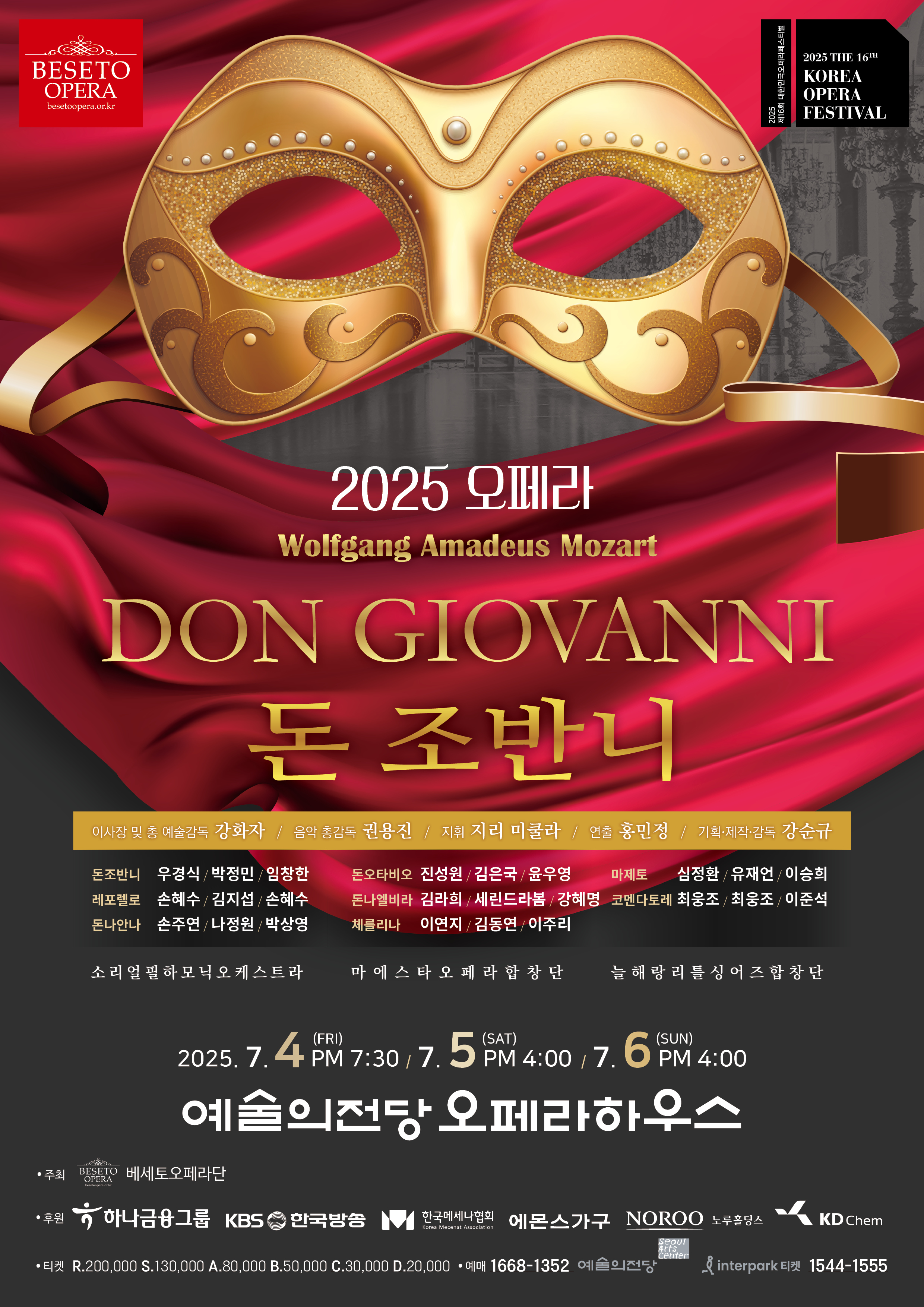 | 출 연 | 돈 조반니(Bar.) ∣우경식, 박정민, 임창한 레프렐로(Bass) ∣손혜수, 김지섭 돈나 안나(Sop.) ∣손주연, 나정원, 박상영 체를리나(Sop.) ∣이연지, 김동연, 이주리 코멘다토레(Bass) ∣이준석, 최웅조 돈 오따비오(Ten.) ∣진성원, 김은국, 윤우영 엘비라(Sop.) ∣김라희, 세린드 라봄, 강혜명 마제또(Bar.) ∣심정환, 유재언, 이승희 |