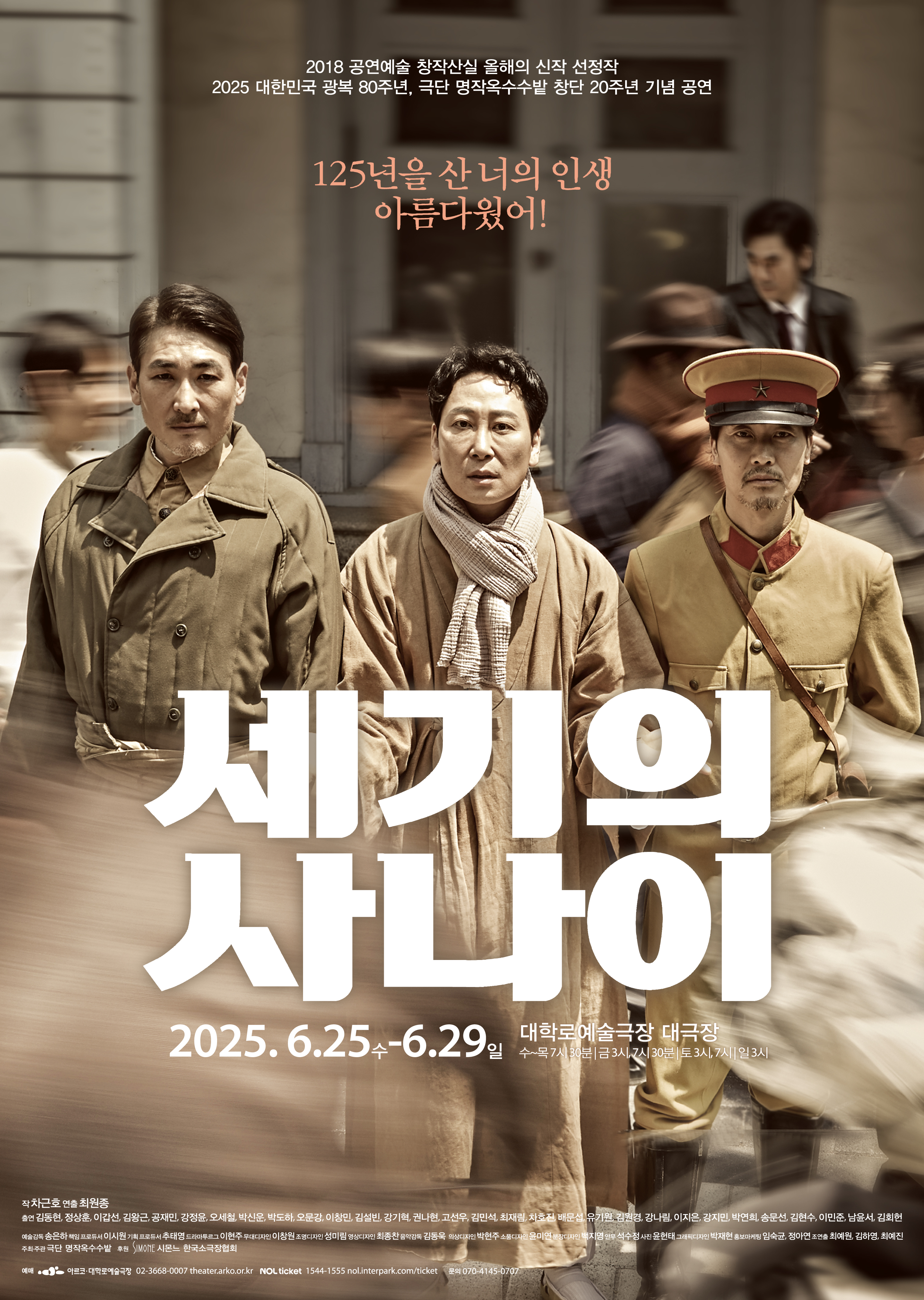 재공연을 앞두고 근현대사를 살아간 역사적 인물들과 소시민들의 생생한 캐릭터를 담은 2종 포스터를 공개했다. 이번 공연은 광복 80주년을 기념하는 뜻깊은 자리로, 명품 핸드백 브랜드 시몬느의 박은관 회장이 후원하여 더욱 특별한 의미를 더한다.