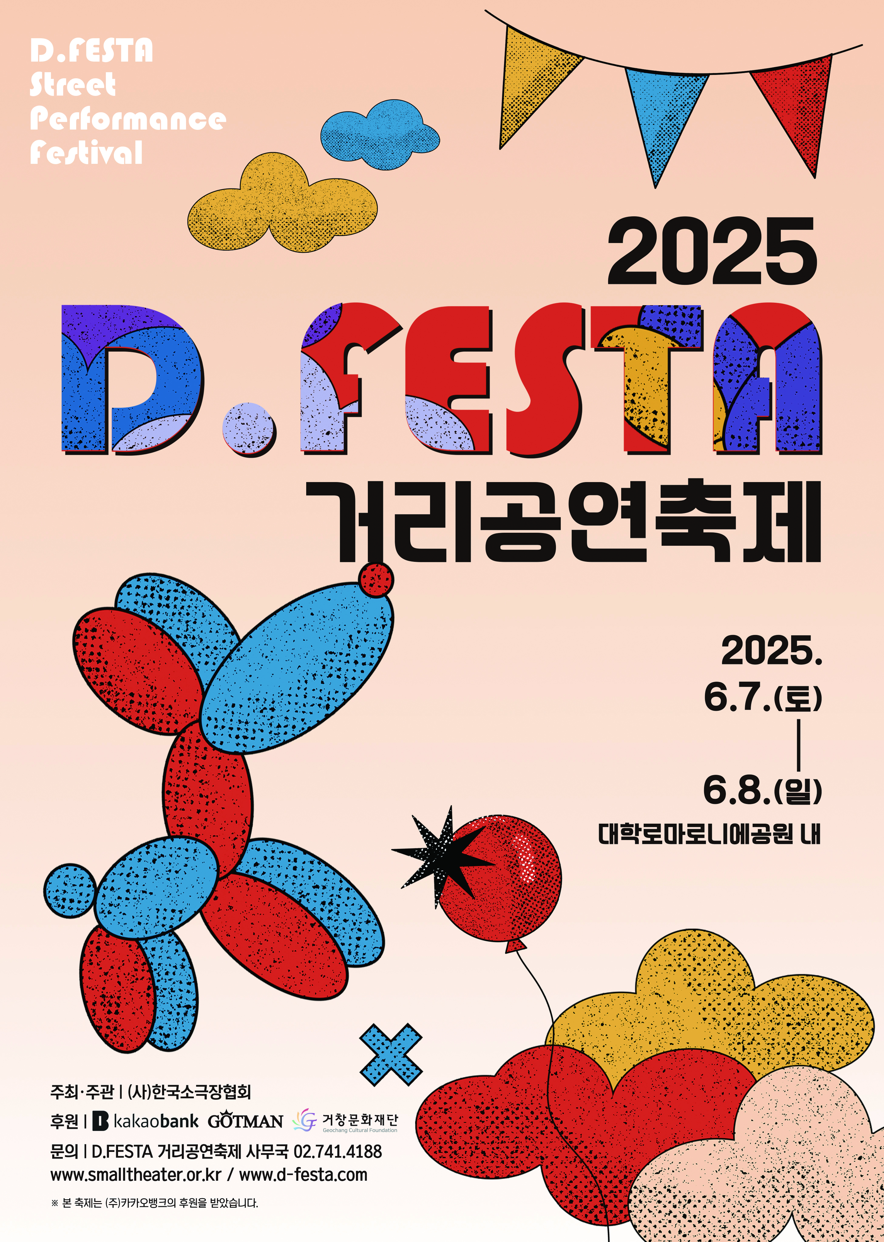 [플레이뉴스 문성식기자] (사)한국소극장협회는 오는 6월 7일(토)부터 8(일)까지 대학로 마로니에공원에서 ‘2025 D.FESTA 거리공연 축제’를 개최한다.
