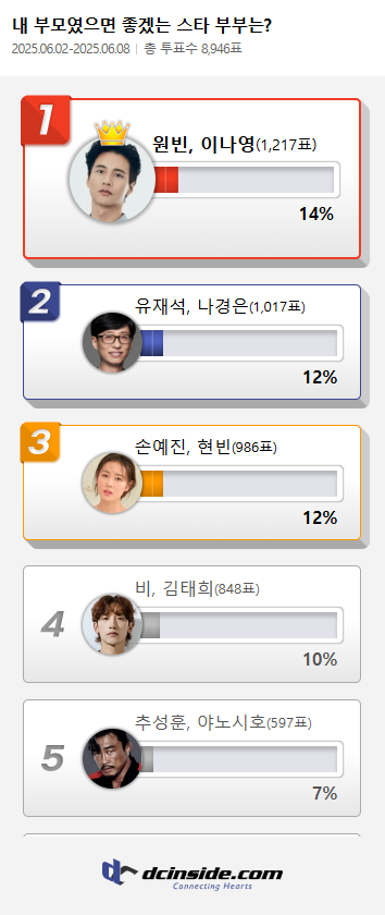 커뮤니티 포털사이트 디시인사이드(대표 김유식)가 `내 부모였으면 좋겠는 스타 부부는?`으로 투표를 한 결과 '원빈, 이나영'이 1위에 올랐다. 이 투표는 지난 2일부터 8일까지 총 7일간 진행했다.