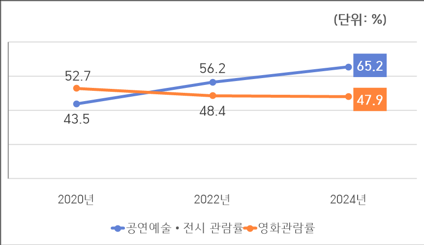 처음으로 공연예술·전시관람(56.2%)이 영화 관람(48.4%)을 뛰어넘었던 지난 조사에 이어 이번에도 공연예술·전시 관람 65.2%, 영화 관람 47.9%로 격차가 더 벌어졌다.