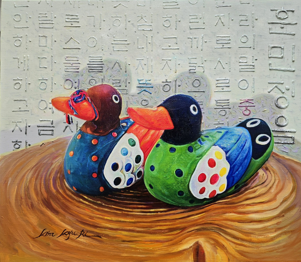 원앙과 훈민정음의 조합으로 생성된 'Evolution-행복회로' 작품은 원앙에서 느껴지는 오방색과 바탕에 새겨진 한글의 형상이 조화롭게 펼쳐져 있고, 우리 전통적 이미지를 유화로 제작하여 더욱 친숙한 느낌을 준다.