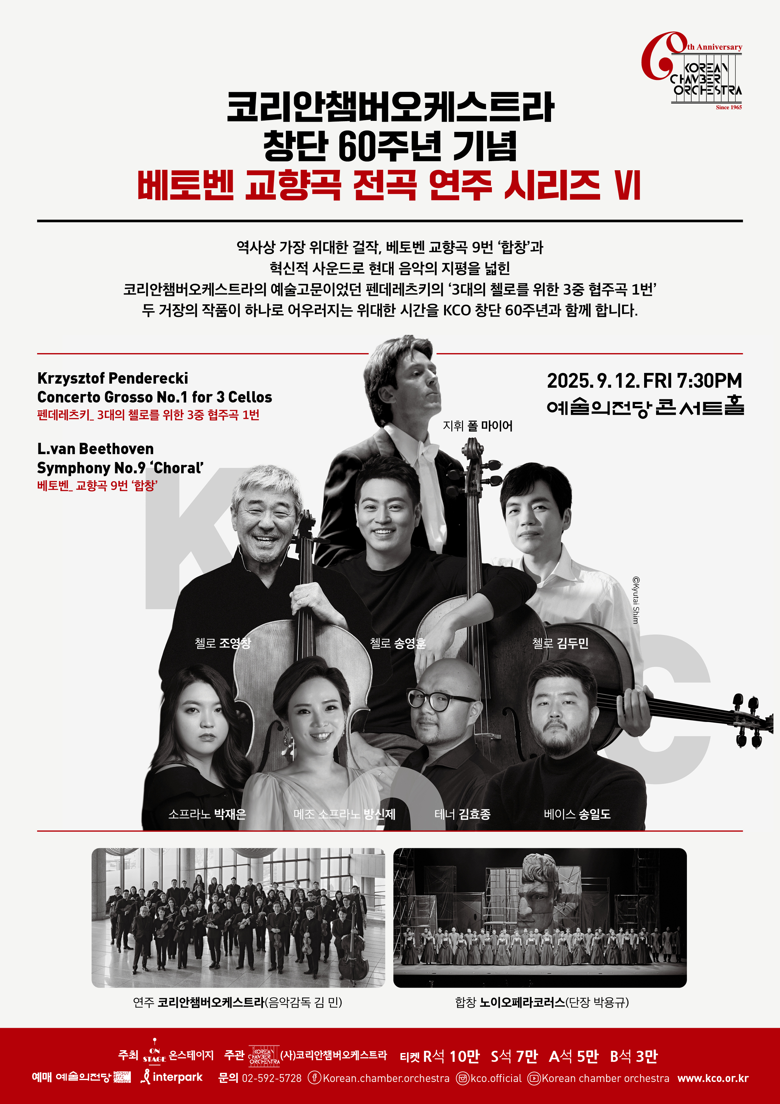 역사상 가장 위대한 걸작, 베토벤 교향곡 9번 ‘합창’과 혁신적 사운드로 현대 음악의 지평을 넓힌 코리안챔버오케스트라 예술고문이었던 펜데레츠키의 ‘3대의 첼로를 위한 3중 협주곡 1번’두 거장의 작품이 하나로 어우러지는 위대한 시간을 KCO 창단 60주년과 함께 한다