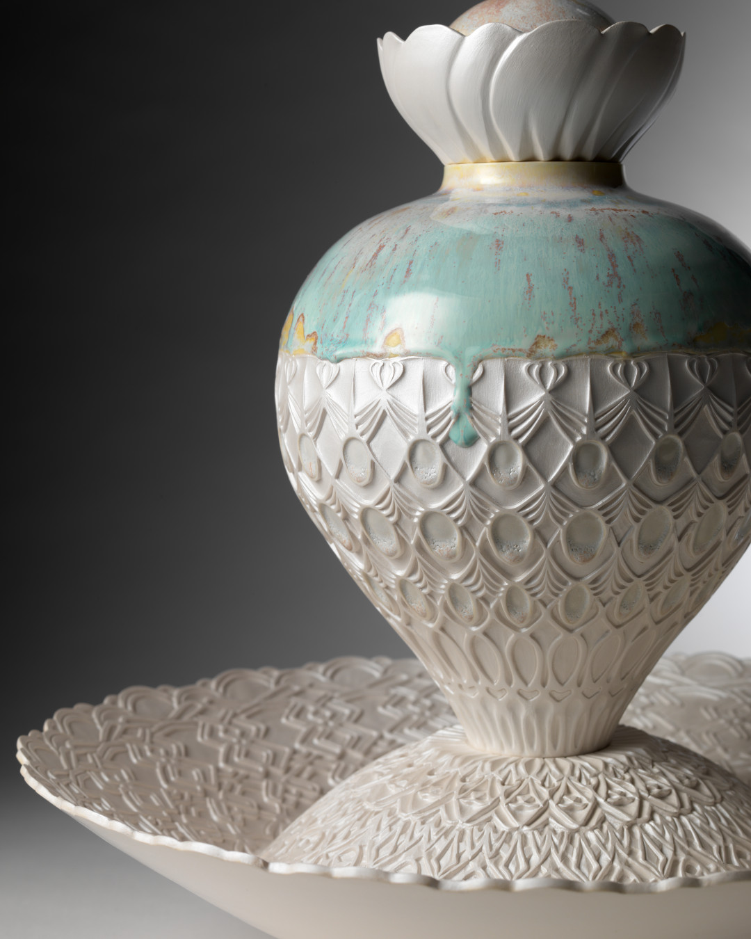 특히 권혜인 작가의 기법적 특징은 물레 성형한 기물의 표면에 조각도로 정교하게 작가만의 문양을 새기고, 번조과정에서 조각과 부조의 깊이에 따라 번지거나 결정이 피는 유약의 색감과 질감을 능숙하게 표현하는 것이다.
