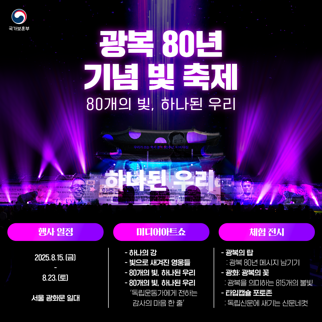 이번 행사는 광복 80년을 대표하는 랜드마크로 조성되었으며, 광화문과 외벽 80m를 거대한 미디어 캔버스로 활용하여 1945년 광복부터 현재까지의 80년 역사를 빛으로 표현(미디어 파사드)하고 있다.