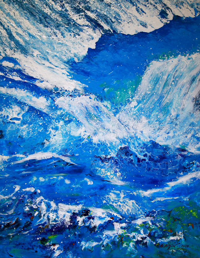 아크릴을 중첩하여 휘몰아치는 거센 파도를 입체감 있게 묘사하였으며, 바다 속을 유영하는 고래의 모습은 동화의 한 장면처럼 따뜻하다.