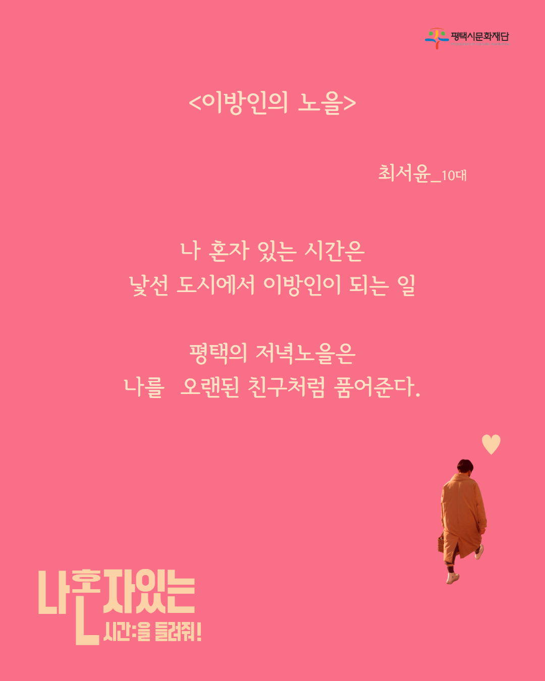 「나‘혼시 프로젝트」는 평택 시민들의 ‘혼자 있는 시간’을 시로 모으고, 이를 통해 서로의 삶을 연결하고자 기획된 시민참여형 문화예술교육 프로젝트다.