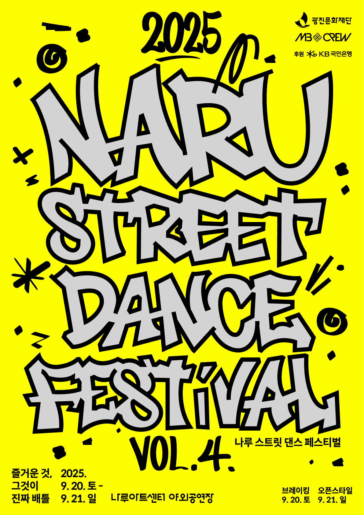 총 우승 상금 1천 5백만원(1,500만원)을 두고 펼치는 '2025 나루 스트릿 댄스 페스티벌'은 9월 20일(토) 브레이킹, 21일(일) 오픈 스타일 장르 2대2 배틀로 각각 진행되며, 전 세계를 무대로 활동 중인 대한민국 대표 댄서들이 심사위원 및 게스트로 참여한다.