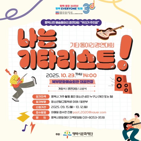 평택시 통합 30주년을 기념하여 지역 내 다양한 예술동아리와 아마추어 예술인들이 모여 서로의 열정과 재능을 나누는 소통의 장 '나는 기타리스트'(10월 23일, 북부문화예술회관)와 '문화대동제'(10월 24일, 서부문화예술회관)가 양일간 이어진다.