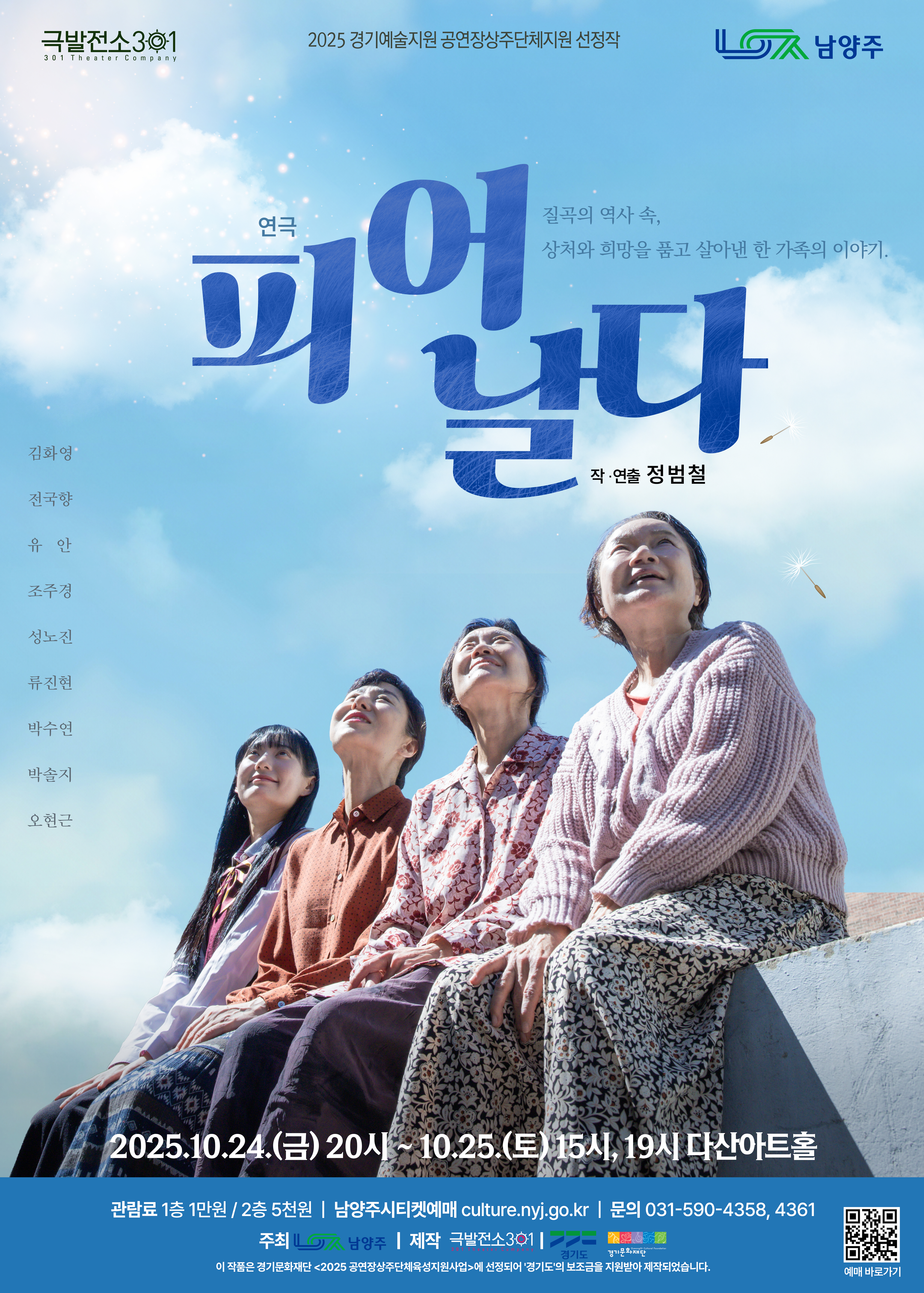 [플레이뉴스 문성식기자] 극발전소301의 신작이자 2025 경기예술지원 공연장상주단체 지원작으로 선정된 연극 '피어 날다'가 오는 10월 24일(금), 25일(토) 남양주 다산아트홀에서 첫 선을 보인 후 11월 6일(목)부터 9일(일)까지 서울 성수아트홀에서 4일 간 공연된다.