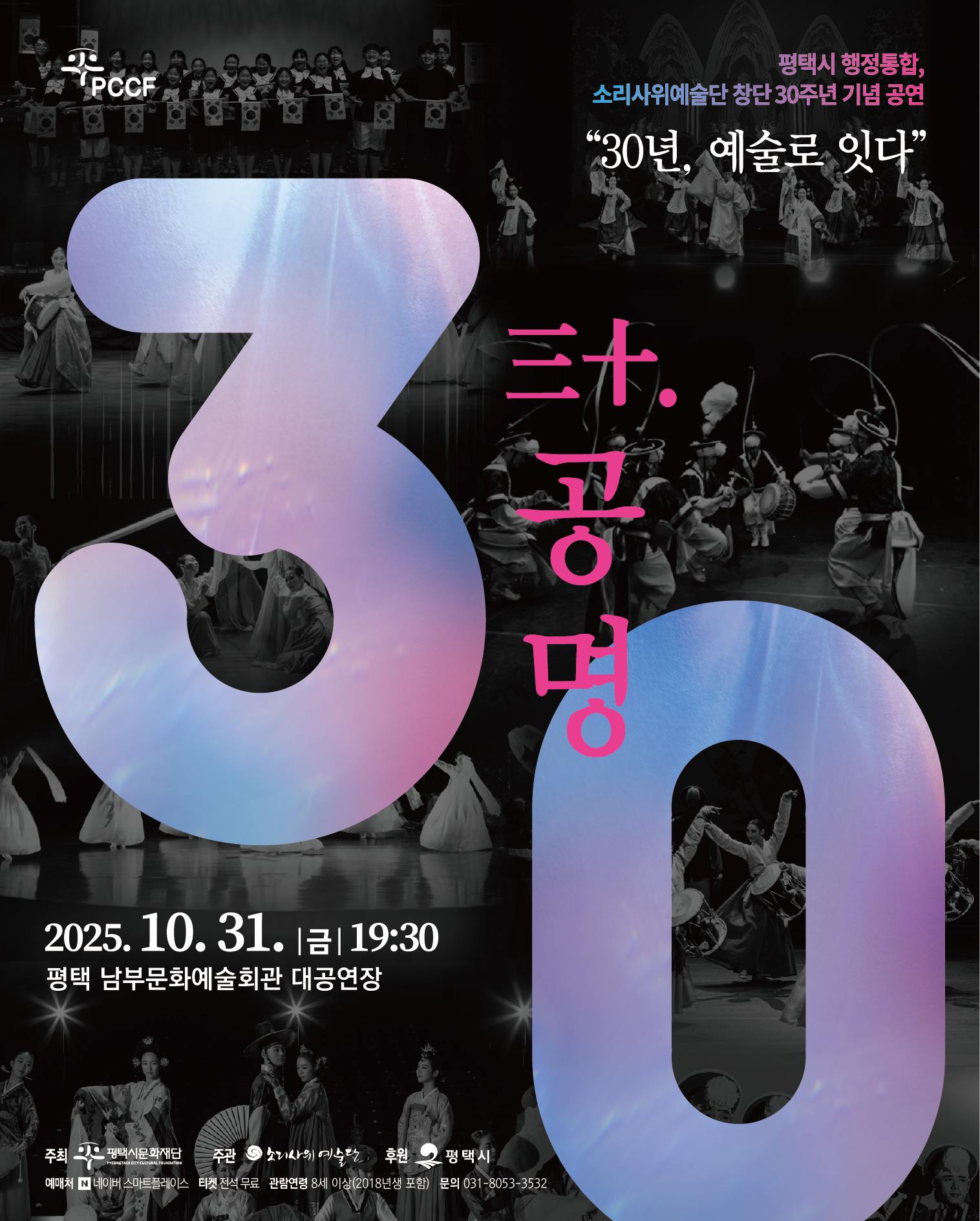 [플레이뉴스 문성식기자] (재)평택시문화재단(대표이사 이상균)은 평택시 행정통합 30주년과 경기도 지정 전문 예술법인 소리사위예술단 창단 30주년을 기념하여, 오는 10월 31일(금) 오후 7시 30분, 평택 남부문화예술회관 대공연장에서 기념공연 〈三十, 공명(삼십, 공명)〉을 개최한다.
