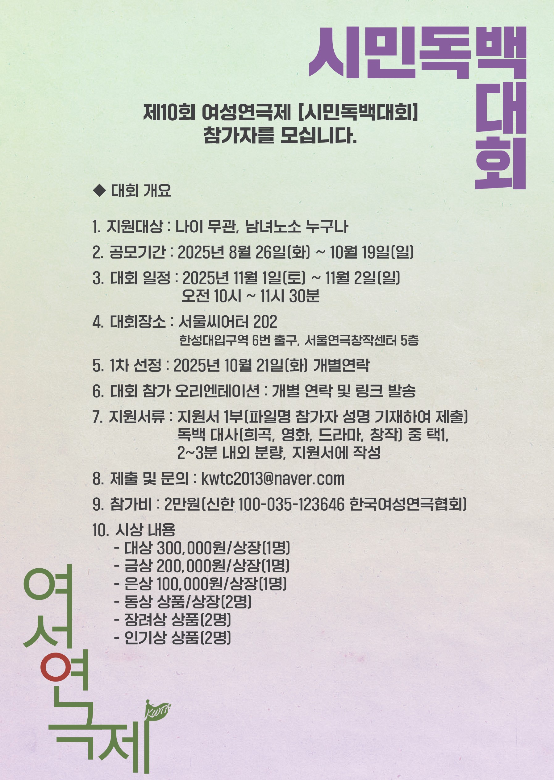 이번 시민독백대회는 이미 참가자 모집이 완료되어, 본선 무대에 오를 시민 배우들이 각자의 개성으로 무대를 채울 예정이다. 심사 결과에 따라 대상(상금 30만원)부터 인기상까지 총 7명의 수상자가 선정되며, 시상식은 11월 16일(토) 오후 5시 서울씨어터 202에서 열린다.