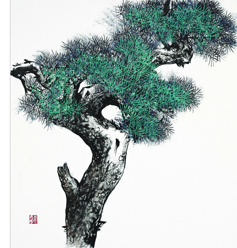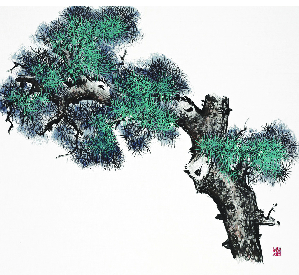 자유롭게 뻗은 나무의 형상을 예술로 풀어내고, 한지 바탕의 흰색과 푸른 솔잎의 대비는 주제를 확대 부각시켜 친근함으로 다가온다.