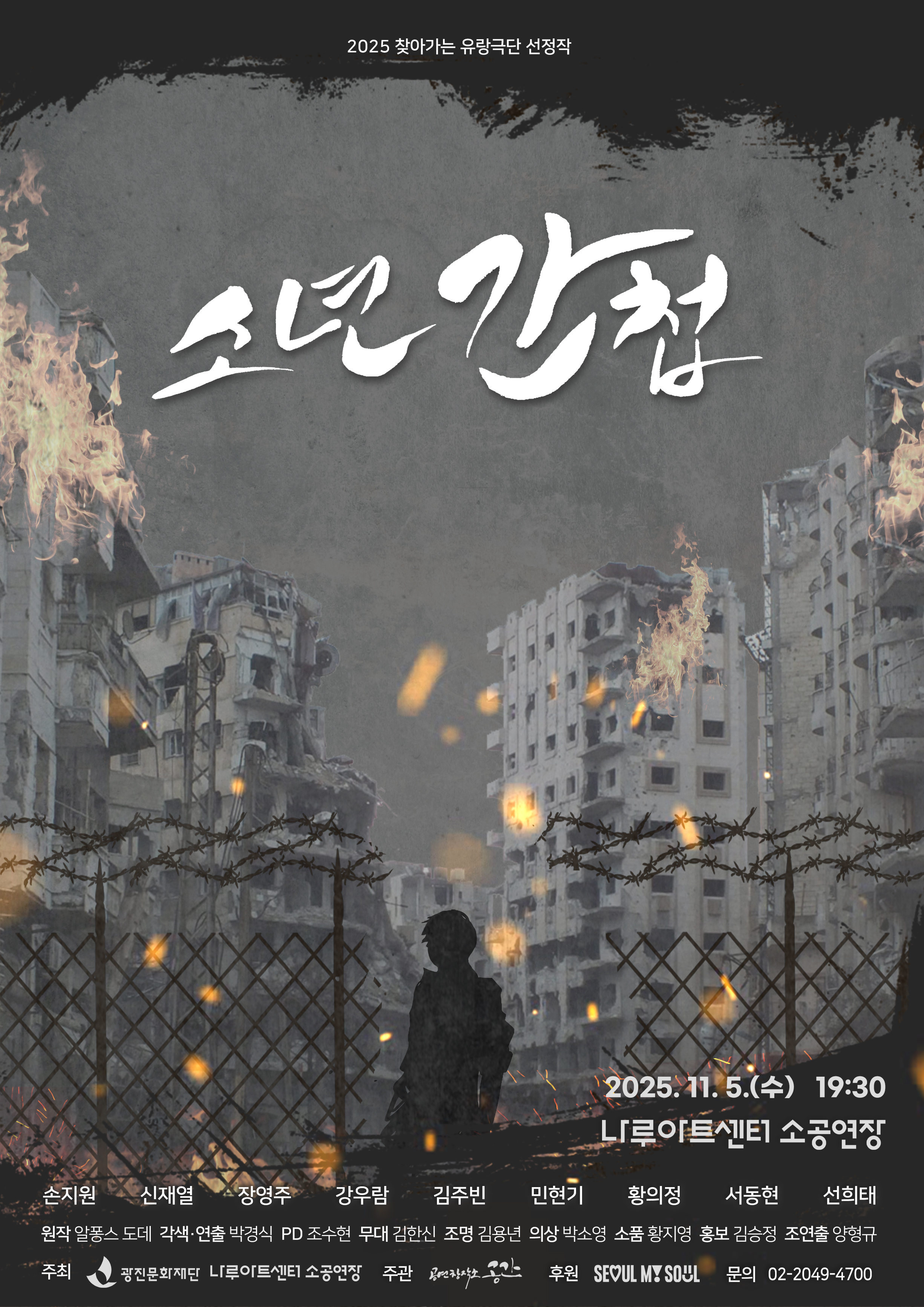 ‣ 공 연 명 : 연극 '소년간첩' ‣ 공연일시 : 2025. 11. 5.(수) 19:30 ‣ 공연장소 : 나루아트센터 소공연장 ‣ 주 최 : (재)광진문화재단 ‣ 주 관 : 공연창작소 공간 ‣ 소요시간 : 90분 ‣ 입장연령 : 10세 이상 ‣ 입 장 권 : 무료 ‣ 예약문의 : 02-2049-4700 |