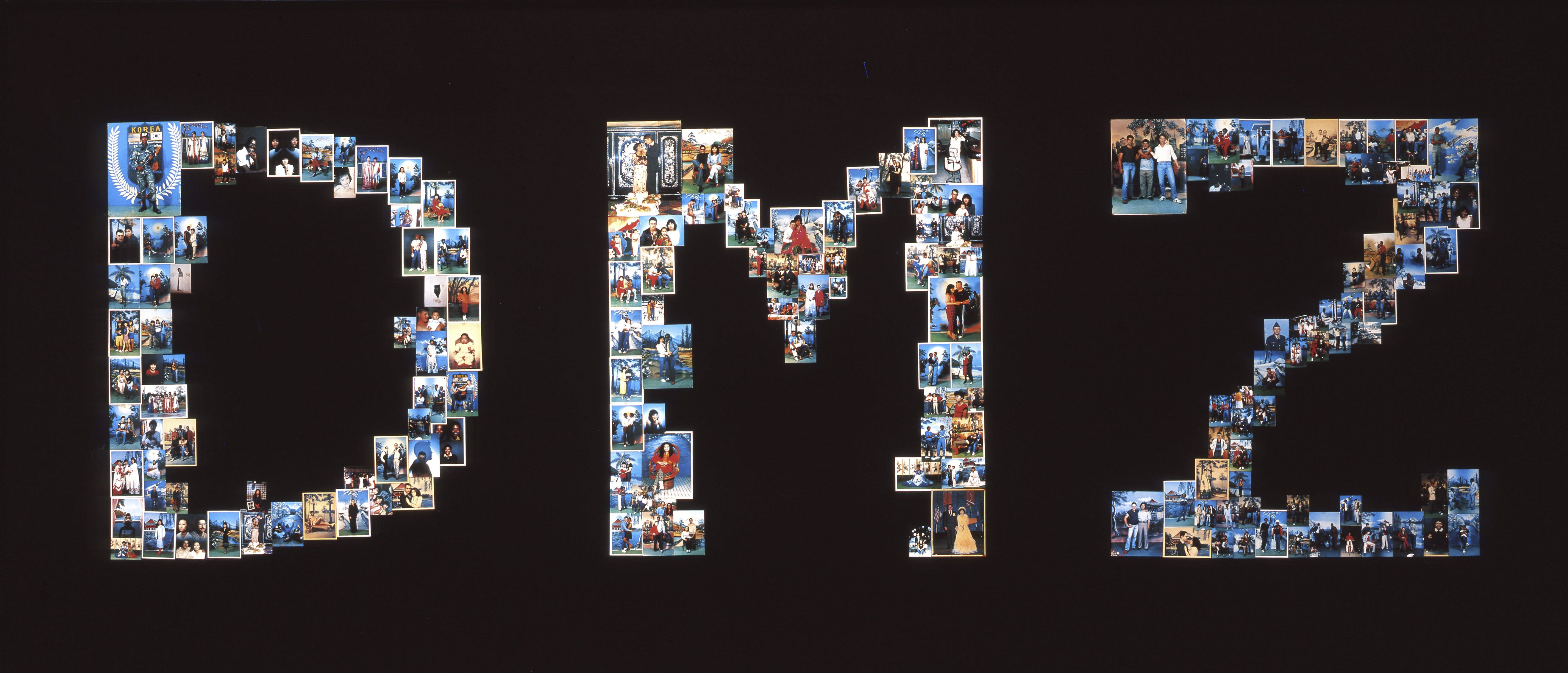 | 작품설명 | 〈DMZ〉(연도미상)는 동두천과 의정부 등 미군부대 주변 사진관에서 직접 수집한 미군과 한국 여성들의 기념사진으로 구성된 작품이다. 김용태는 손님들이 촬영 후 찾아가지 않은 약 800여 장의 사진을 모아 그중 180여 장을 선별하고, 이를 검은 배경 위에 배열해 영어 대문자 ‘DMZ(비무장지대)’를 형성했다. 냉전의 경계이자 분단의 상징인 DMZ라는 문자 속에 담긴 개인의 초상들은 군사적 현실과 일상의 문화가 교차하는 복합적 풍경을 드러낸다. 사진 속 인물들의 표정과 제스처, 불국사·용·남산타워·야자수 등 이질적인 배경이 뒤섞인 이미지는 한국 근대사의 혼종성과 냉전기의 문화적 이중성을 상징한다. 버려진 기념사진을 수집해 개인의 초상을 역사적 은유로 전환시킨 작품으로, 분단과 냉전의 현실을 일상적 이미지 속에서 비판적으로 재구성한 개념적 민중미술의 대표적 사례라 할 수 있다. |