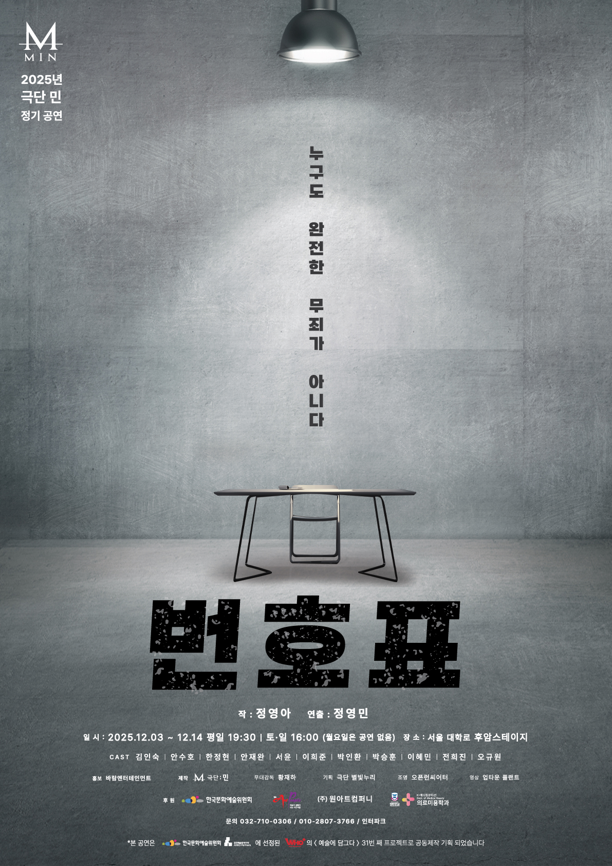 [플레이뉴스 문성식기자] 2025년 인천 서구 예술활동지원사업으로 선정된 연극‘번호표’가대학로 후암스테이지에서 12월 3일부터 14일까지 공연을 올린다.