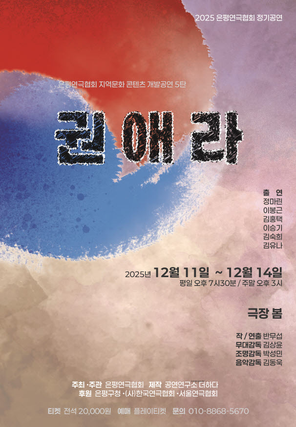 [플레이뉴스 문성식기자] 2025년 은평연극협회 정기공연이고 주관하는 연극 '권애라'가 오는 12월 11일부터 14일까지 극장 봄 무대에 올려 평일 오후 7시 30분, 주말 오후 3시에 관객과 만난다. 제작은 ‘공연연구소 더하다’ 가 맡았다.