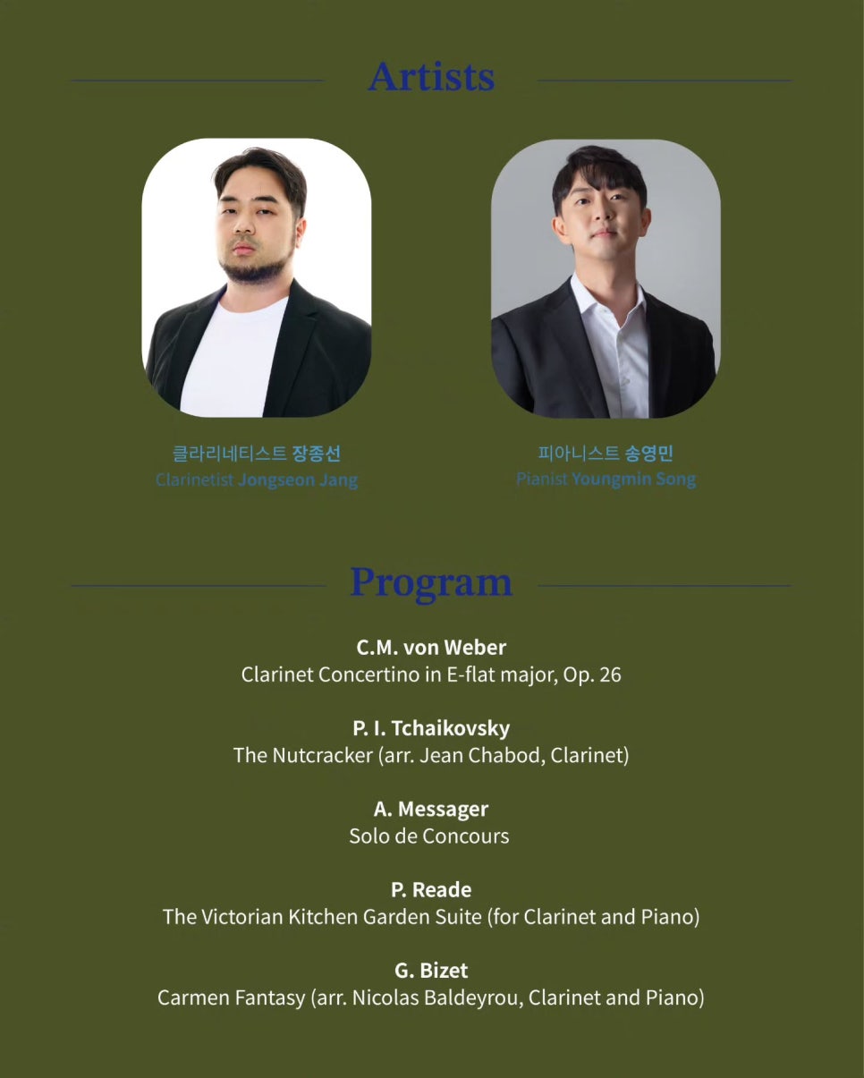 풍부한 음악적 해석과 섬세한 소리를 기반으로 자신만의 음악 세계를 구축해온 그는 2025년의의 마지막 밤을 클라리넷의 다채로운 매력으로 채우는 무대를 선보일 예정이다. 피아니스트 송영민이 그와 함께 호흡을 맞춘다.