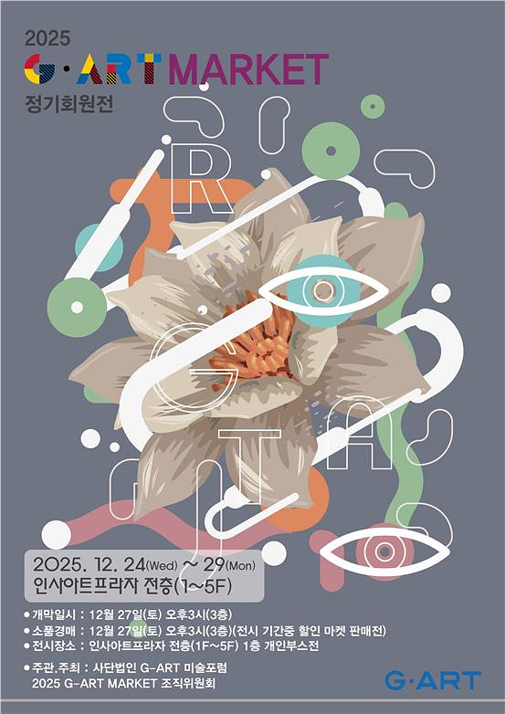 [플레이뉴스 문성식기자] 사단법인 GART미술포럼과 2025 G-ART MARKET 조직위원회는 2025년 12월 24일(수) ~ 12월 29일(월)까지 서울 인사동에 위치한 인사아트프라자 전관(1F~5F)에서 ‘2025 G-ART MARKET展’을 개최한다.