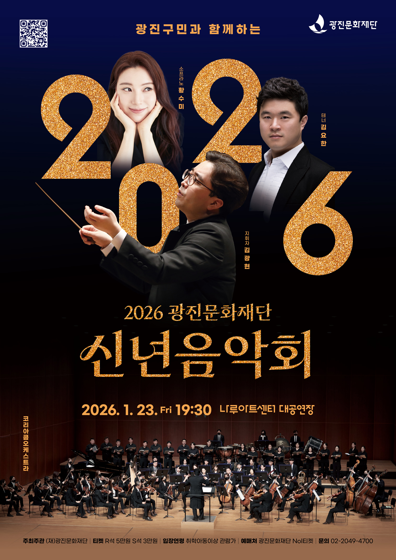 ‣ 공 연 명 : 광진구민과 함께하는 '2026 광진문화재단 신년음악회' ‣ 공연일시 : 2026. 1. 23.(금) 19시 30분 ‣ 공연장소 : 나루아트센터 대공연장 ‣ 주최/주관 : (재)광진문화재단 ‣ 소요시간 : 110분(인터미션 15분 포함) ‣ 입장연령 : 취학아동 이상 관람가능 ‣ 입 장 권 : R석 5만원 / S석 3만원 / 시야방해석 1만원 ‣ 예매문의 : 02-2049-4700 |