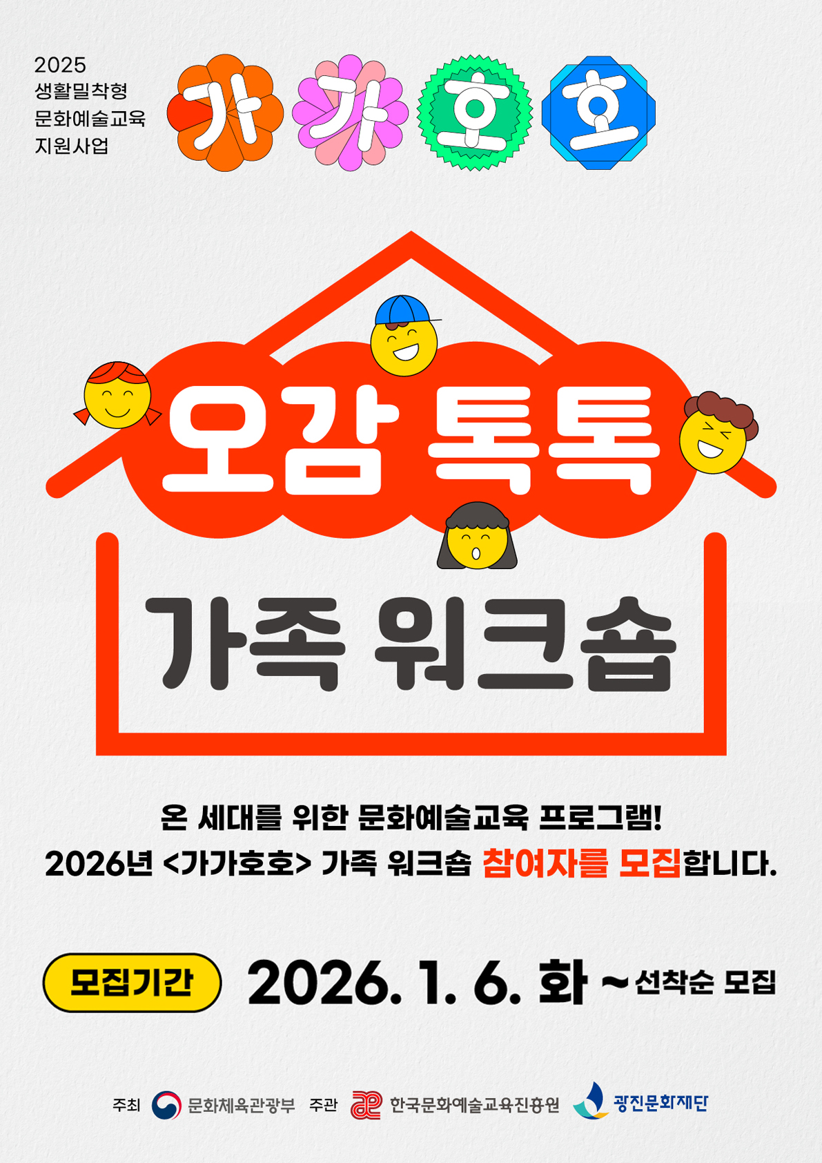 ‣ 행 사 명 : 오감 톡톡! 가가호호 ‣ 행사일시 : 2026. 1. 23.(금) ~ 24.(토) ‣ 행사장소 : 나루아트센터 스페이스 76, 광진문화재단 창작공간 ‣ 주최/주관 : (재)광진문화재단 ‣ 소요시간 : 프로그램별 상이 ‣ 모집대상 : 만6~8세 어린이와 가족, 예비부부, 부부 등 ‣ 체 험 비 : 무료 ‣ 행사문의 : 02-2049-4700 |