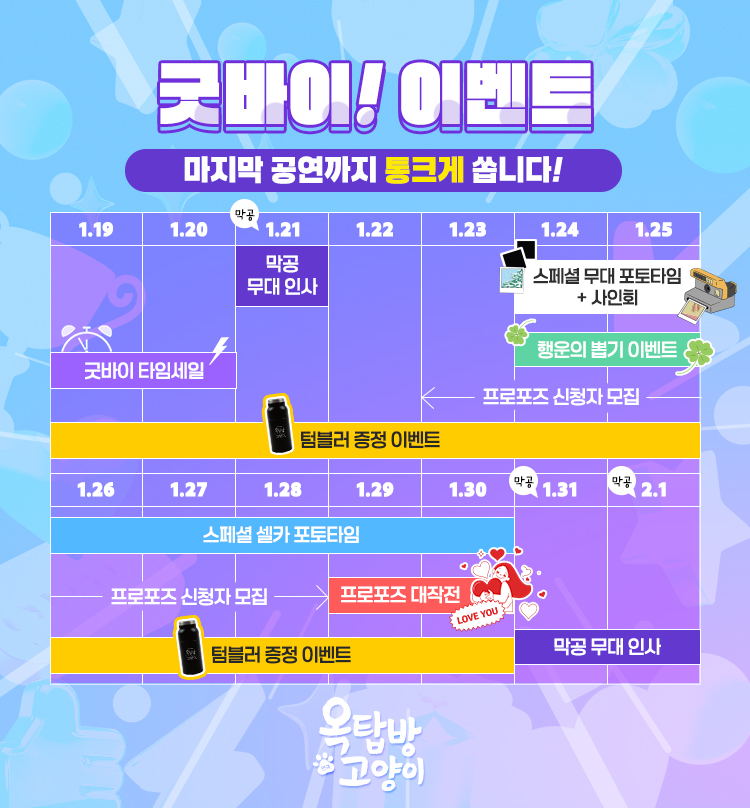 이 밖에도 최대 70% 파격 특가로 공연을 만나볼 수 있는 ‘Goodbye 타임세일’, 옥탑방고양이 한정 ‘스페셜 텀블러 증정’, 화장품, 공연 초대권 등 참여만 해도 푸짐한 경품을 받을 수 있는 ‘행운의 뽑기 이벤트’ 등 다양한 이벤트를 남은 10일 동안 즐길 수 있다.