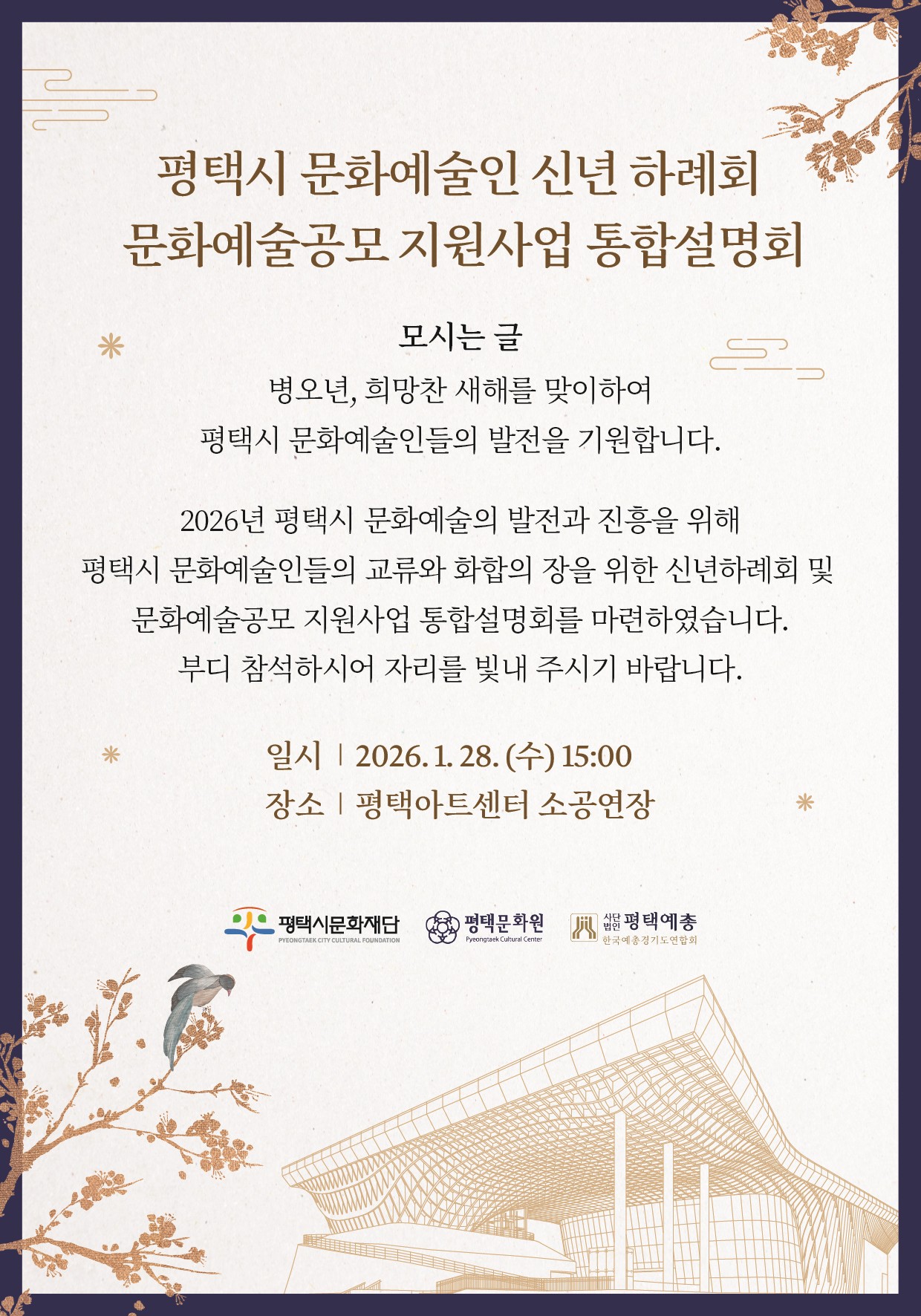 [플레이뉴스 문성식기자] 평택시문화재단(대표이사 이상균)은 지역 문화예술 활성화를 위해 지역 예술인과 예술단체의 창작 활동을 지원하는 ‘2026 평택문화예술활동 지원사업’ 공모 접수를 오는 1월 26일부터 2월 9일까지 진행한다.