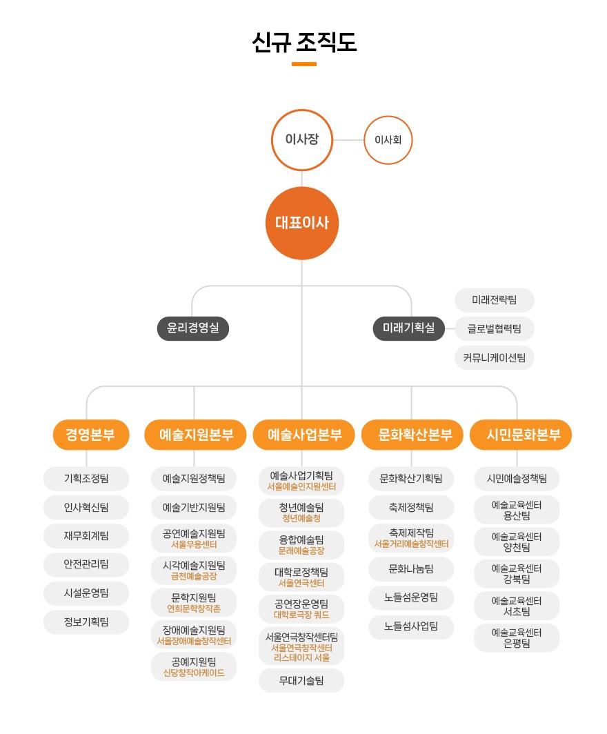 | ◇경영본부 △기획조정팀 △인사혁신팀 △재무회계팀 △안전관리팀 △시설운영팀 △정보기획팀 ◇예술지원본부 △예술지원정책팀 △예술기반지원팀 △공연예술지원팀 △시각예술지원팀 △문학지원팀 △장애예술지원팀 △공예지원팀 ◇예술사업본부 △청년예술팀 △융합예술팀 △대학로정책팀 △공연장운영팀 △서울연극창작센터팀 △무대기술팀 ◇문화확산본부 △문화확산기획팀 △축제정책팀 △축제제작팀 △문화나눔팀 △노들섬운영팀 △노들섬사업팀 ◇시민문화본부 △시민예술지원팀 △예술교육센터용산팀 △예술교육센터양천팀 △예술교육센터강북팀 △예술교육센터서초팀 △예술교육센터은평팀 ◇미래기획실 △미래전략팀 △글로벌협력팀 △커뮤니케이션팀 ◇윤리경영실 |
