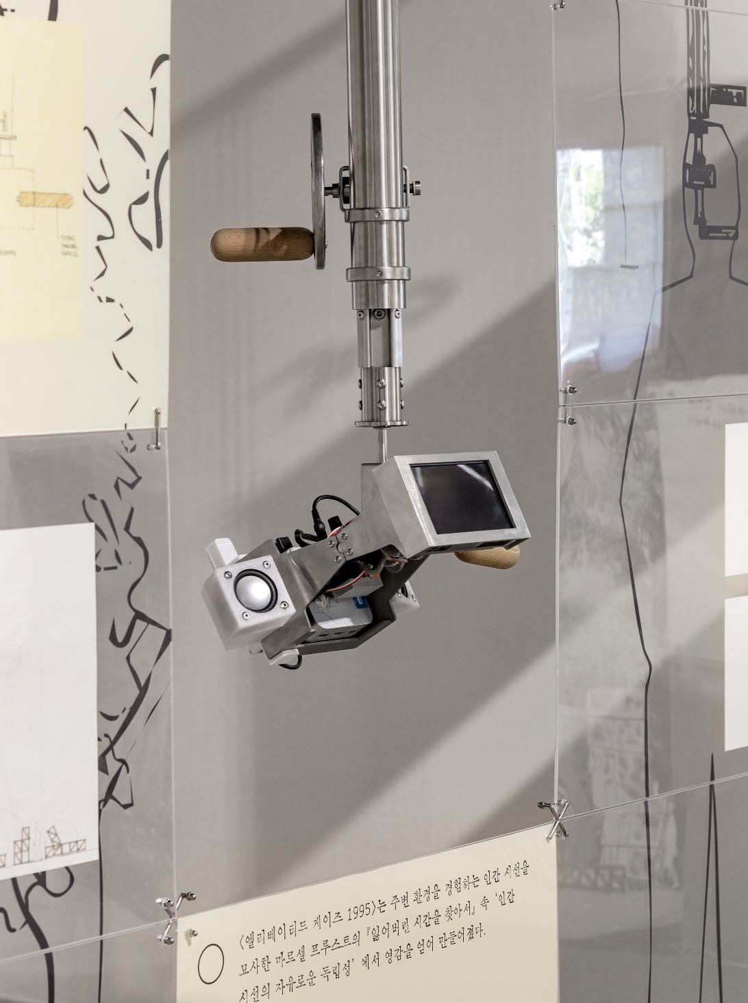 〈나무의 시간〉은 한국관의 중요한 설계 조건인 ‘나무’에 반응하는 건축적 장치다. 〈그림자 감지 장치〉, 〈자르디니 건축 여행자〉, 〈엘리베이티드 게이즈 1995〉등 세 개의 유닛으로 구성된 이 작업은 자르디니의 나무와 숲, 그리고 이를 받아들이는 한국관의 투명한 구조에 주목한다. 베니스에서는 전시장 중앙에 설치되어, 빛과 그림자, 바람과 계절처럼 변화하는 요소들이 전시 경험에 개입하는 방식을 보여주었다. 귀국전에서는 현지에서만 가능한 경험을 복제하기보다, 베니스에서 채집한 감각을 기록과 기억의 층위에서 다시 불러낸다. 초기 아이디어를 물리적 구현하는 과정에서 생산된 드로잉을 중심으로 비물질적인 요소를 물질화하는 감각을 보여준다. 더불어 베니스 현지에서 관객이 작품을 경험하는 영상을 통해 이런 작가의 의도가 전달되는 과정을 살펴본다. |