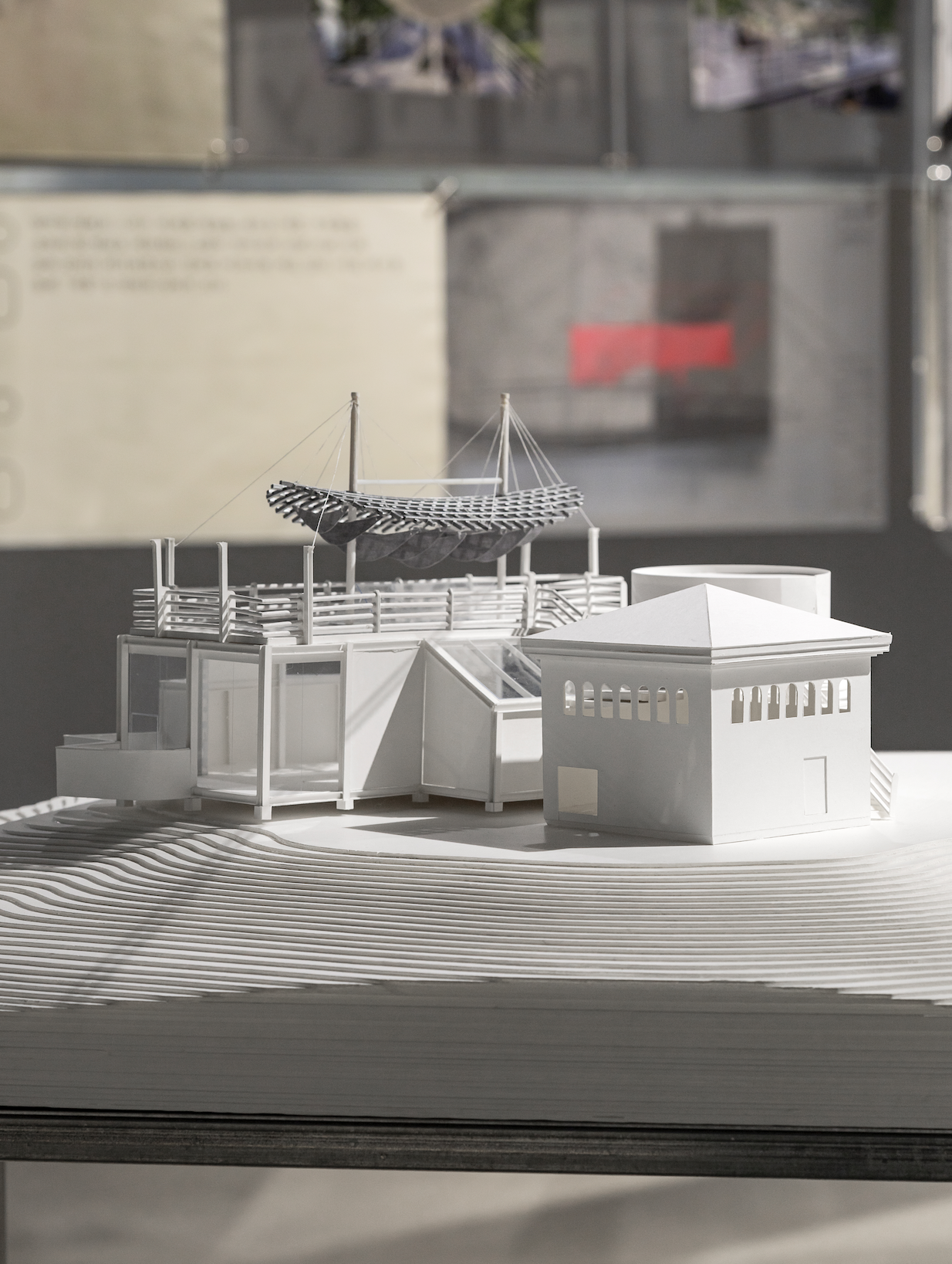 〈새로운 항해〉는 한국관 옥상이라는 특별한 장소에서 출발한 작업이다. 옥상 접근이 제한적인 다른 국가관과 달리, 이 작업은 옥상을 모두에게 열린 전망대로 제안하며 근미래 국가관 간의 연대 가능성을 암시한다. 바다를 향해 돛을 펼친 듯한 한국관 형태에서 착안해, 아드리아해를 바라보는 방향으로 설치되었다. 현장에서는 규약과 안전 문제로 계획이 완전히 실현되지 못했다. 귀국전에서는 이 미완의 상태를 다시 다루며 원래의 개념과 구상을 이미지와 텍스트, 모형으로 제시한다. 이를 통해 전시가 제도와 공간의 규칙 속에서 어떻게 조정되는지를 보여준다. 작업의 주요 레퍼런스와 설치 도면, 모형을 중심으로 한국관 옥상을 배경으로 한 작업의 시작 계기와 온전히 구현되지 못한 원안을 설명한다. |