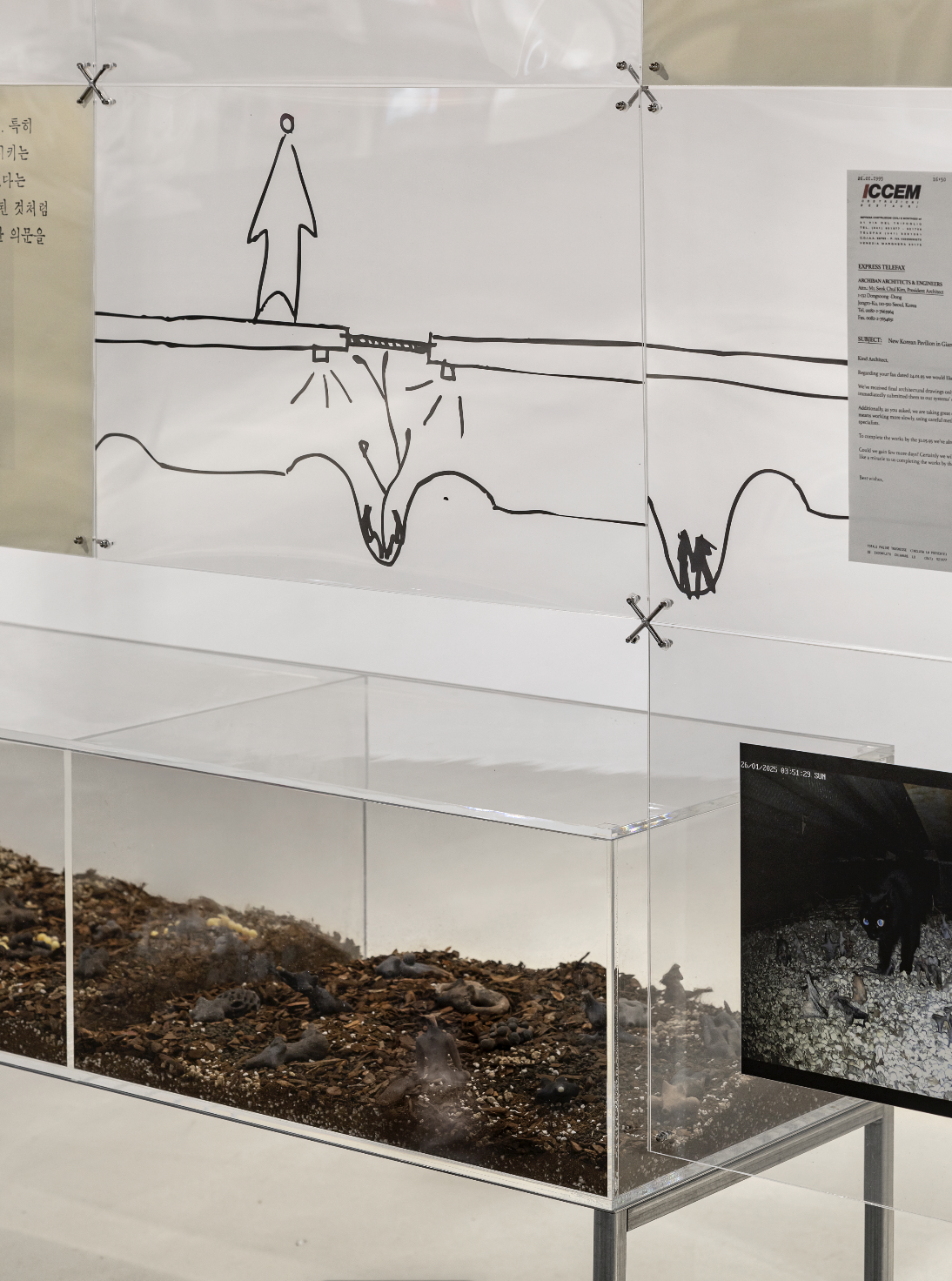 서울 아르코미술관에서 열리는 귀국전은 베니스 전시의 작품과 아카이브 등 전시 구성을 재맥락화해 선보인다. 아르코미술관에 설치된 작업들은 베니스 전시에서 설정한 ‘아카이브’와 ‘커미션’의 두 구성을 따르면서도 편집·가공되었다.