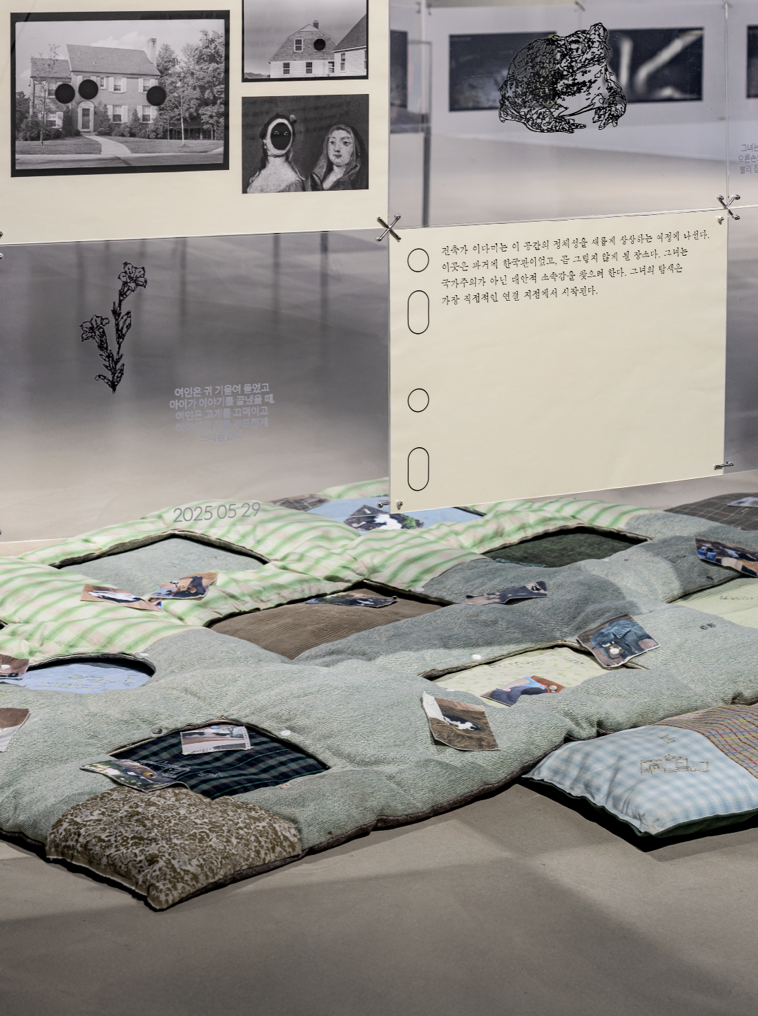 | 4 | 이다미 | ![]() A: 나일론 메시 원단 위 자수, 스테인리스 스틸 와이어와 추, 가변 크기, 2024 B: 한지(적층) 위 인쇄문자와 타공, 가변 크기, 2024 C: 솜을 채운 이불과 베개, 다양한 직물로 만든 커버에 단추와 자수, 나뭇가지·낙엽 등 수집 오브제, 가변 크기, 2024 D: 스테인리스 스틸 봉으로 제작한 가구, 컵·냅킨·돌·나무 조각 등 오브제, 가변 크기, 2024 ![]() 사진 ⓒ최용준 |